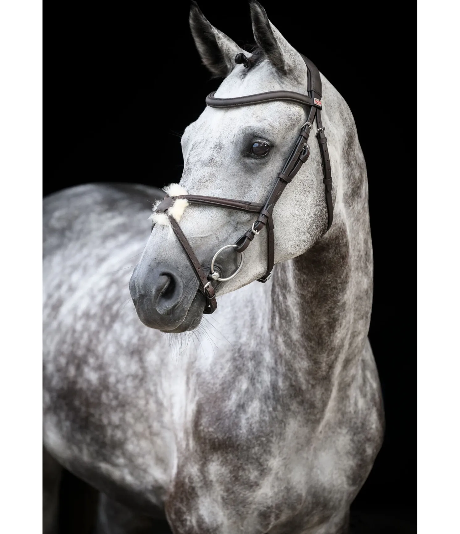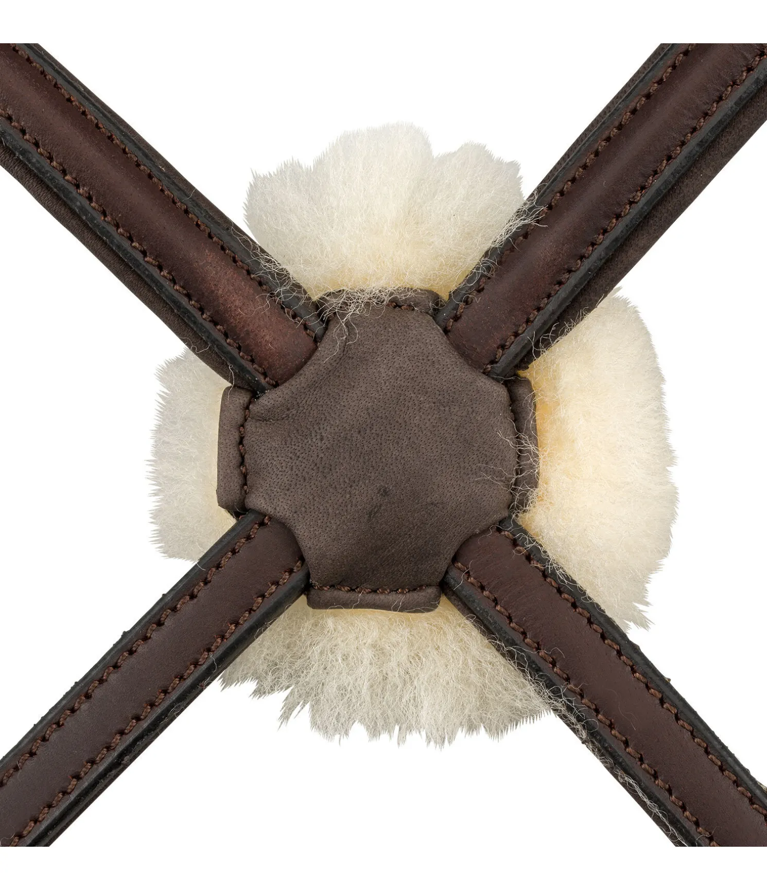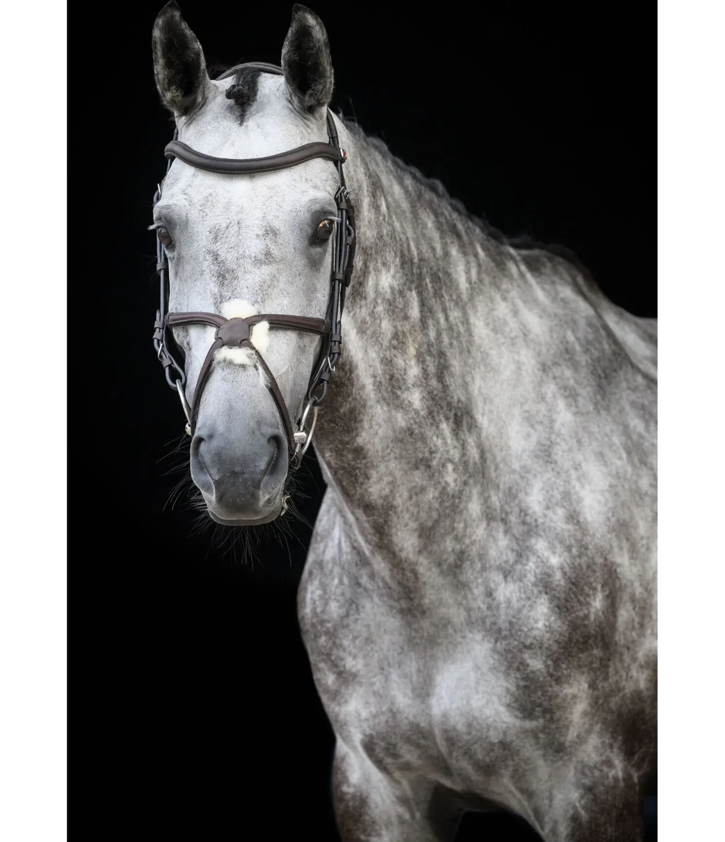 Bridon en cuir avec muserolle croisée avec bases triangulaires sans anneaux gênants. Frontal vague et point de croisement central en cuir souple travaillé, particulièrement agréable et flexible. Têtière anatomique extra-large. Tous les éléments en cuir sont en cuir gras très souple huilé plusieurs fois. Point de croisement doublé en fourrure d’agneau, ce qui le rend idéal pour les chevaux à la tête sensible. Bouclerie argentée. Sans rênes ni mors.