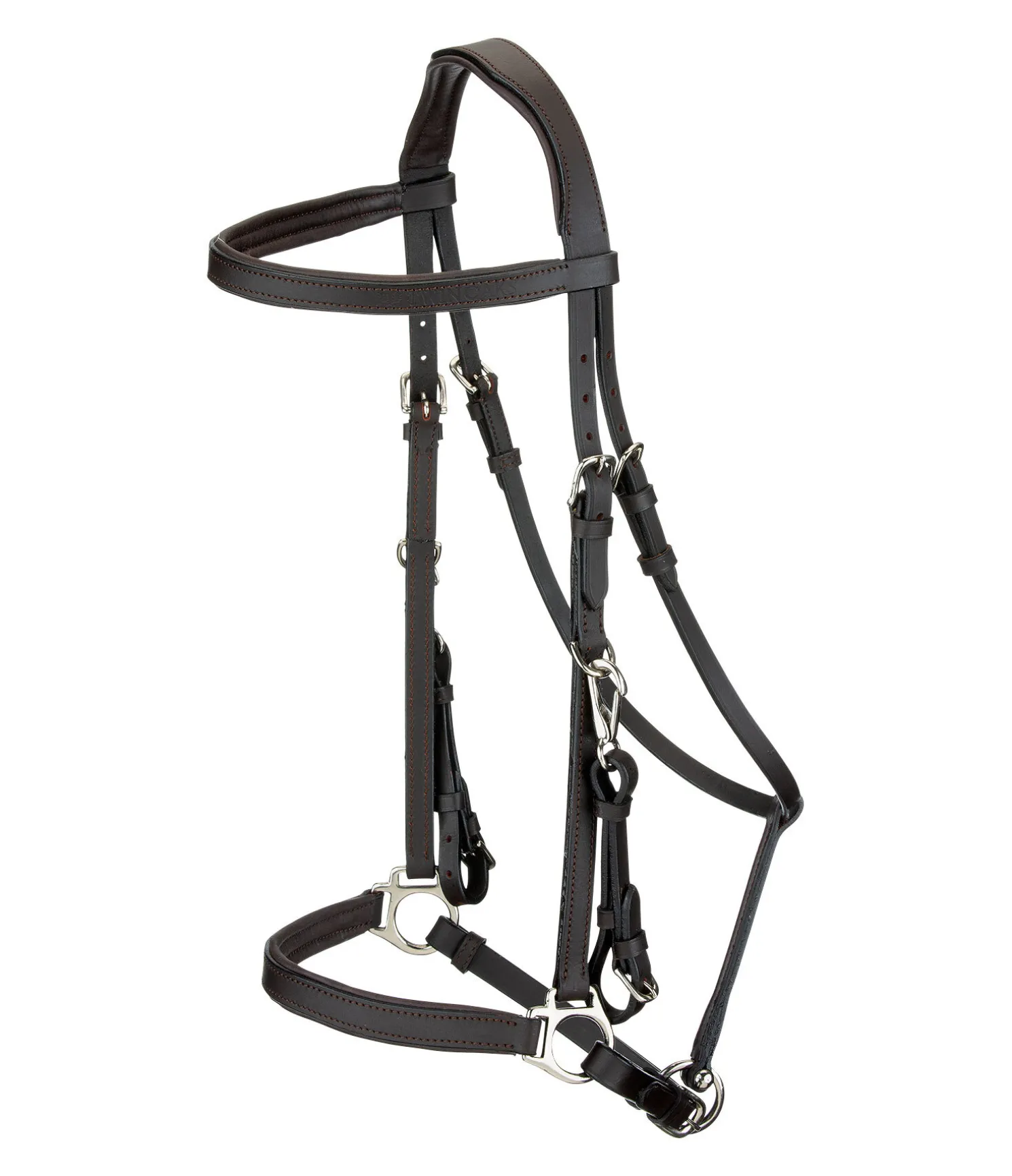 Bridon de randonnée de grande qualité en cuir Premium avec têtière anatomique. Combinaison parfaite d’un bridon et d’un licol. L’anneau sous la muserolle permet de l’utiliser comme licol. Têtière et muserolle avec doublure moelleuse. Bouclerie en acier inoxydable. Avec rênes sangle, sans mors.
