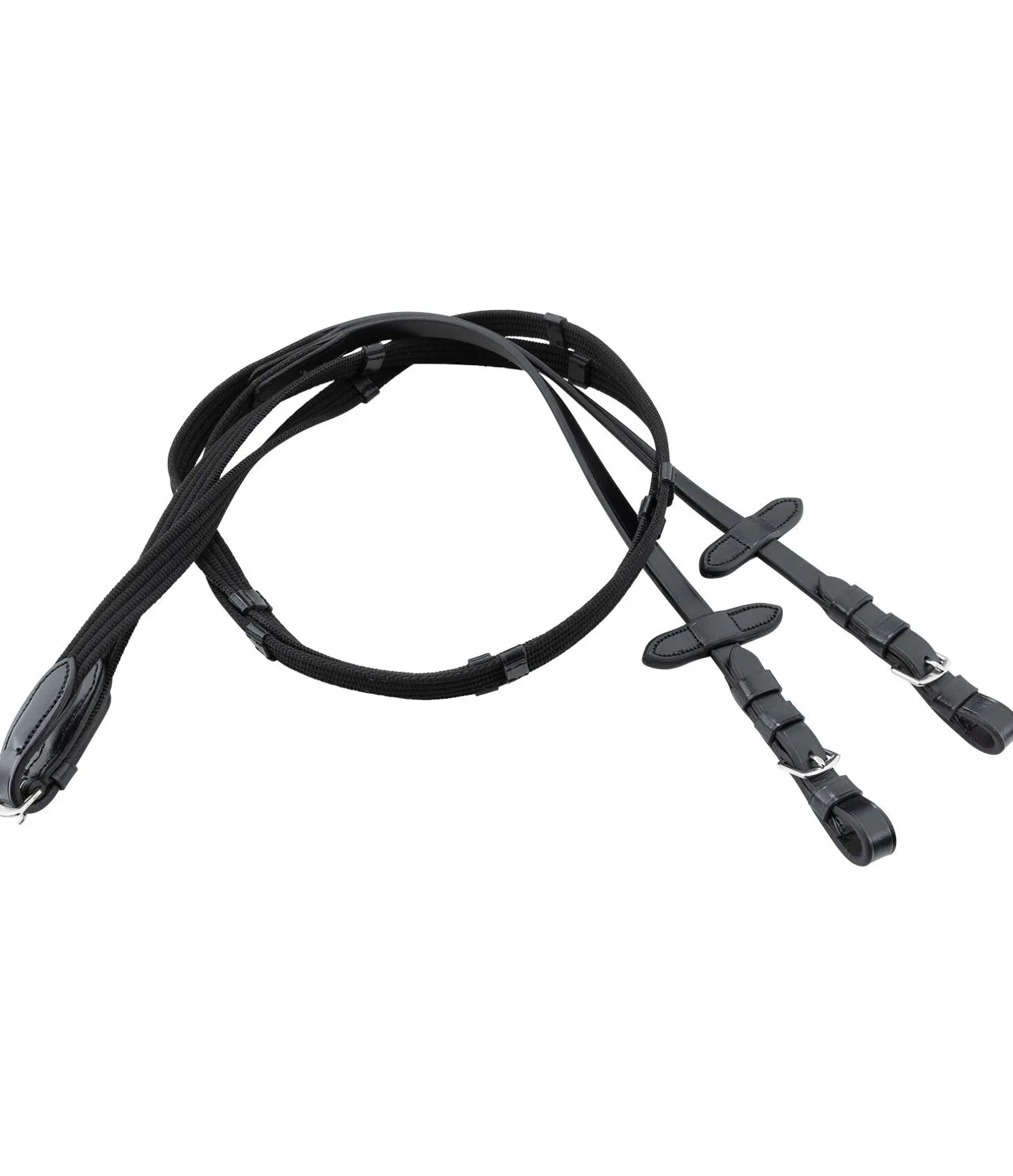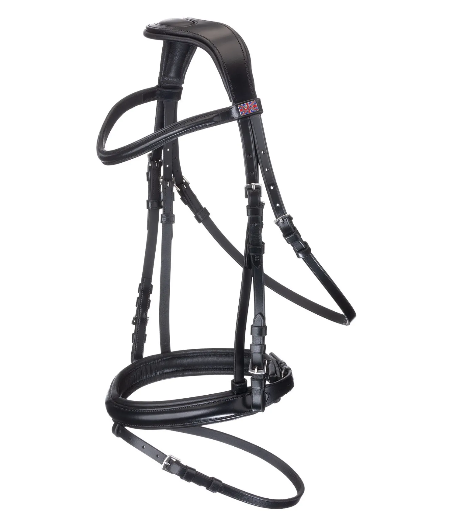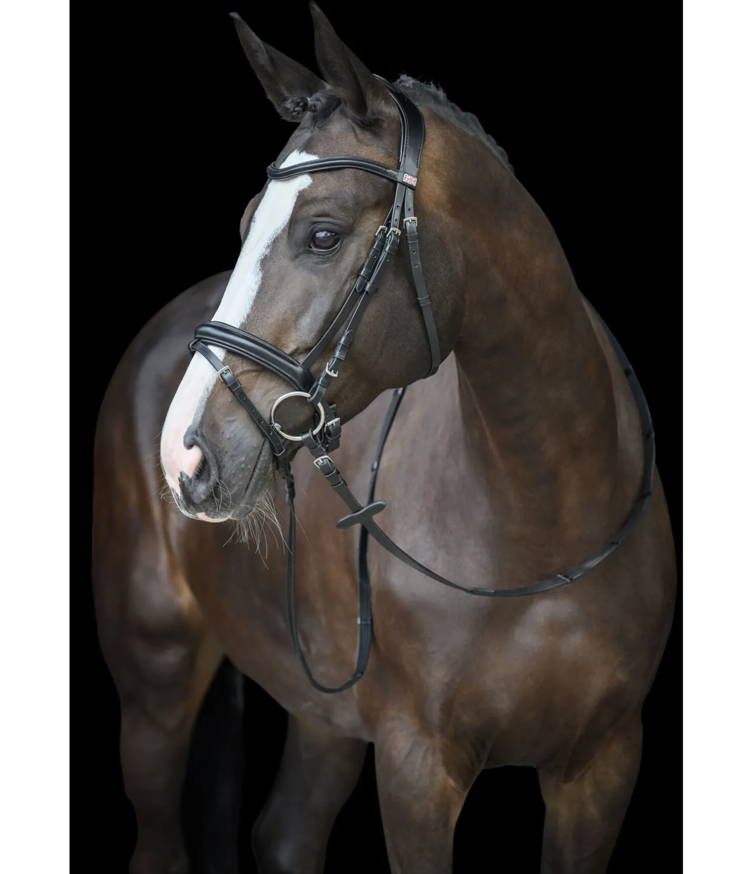 Élégant bridon en cuir avec têtière anatomique innovante assurant un soulagement optimal de la pression dans la zone de la nuque grâce à sa doublure douce et sa découpe large aux oreilles. La large muserolle française combinée est également doublée. Frontal vague classique. Bouclerie argentée. Avec rênes sangle, sans mors.
