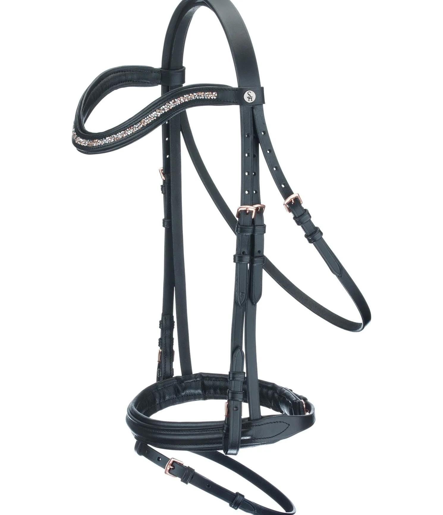 Bridon exceptionnel avec muserolle française combinée et frontal vague scintillant avec pierres scintillantes argentées et rose-doré. Frontal et muserolle avec doublure douce en cuir. Bouclerie rose doré. Avec rênes sangle, sans mors.