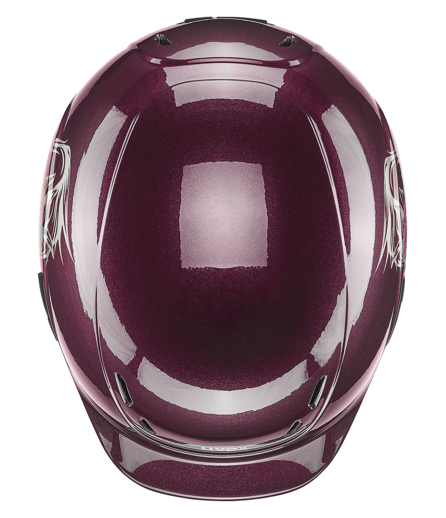Casque d’équitation enfant avec surface scintillante et motif stylé. Ce casque se règle en continu de la taille 49 à 54. La technologie In-Mold, l’ajustement de taille 3D IAS éprouvé ainsi que le système de sangle FAS avec fermeture Monomatic garantissent une sécurité inégalée. Certifié selon la norme EN1384:2023.