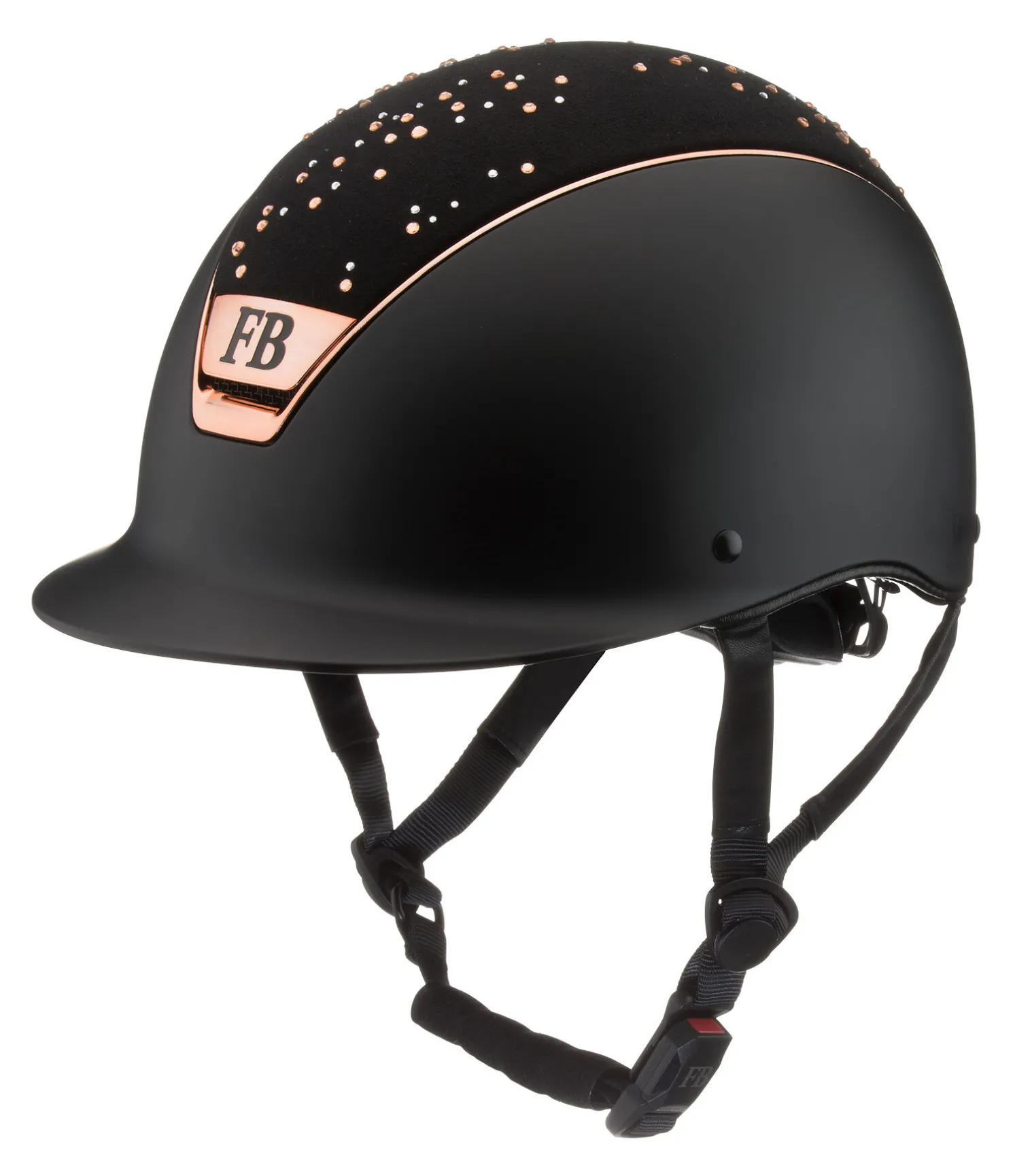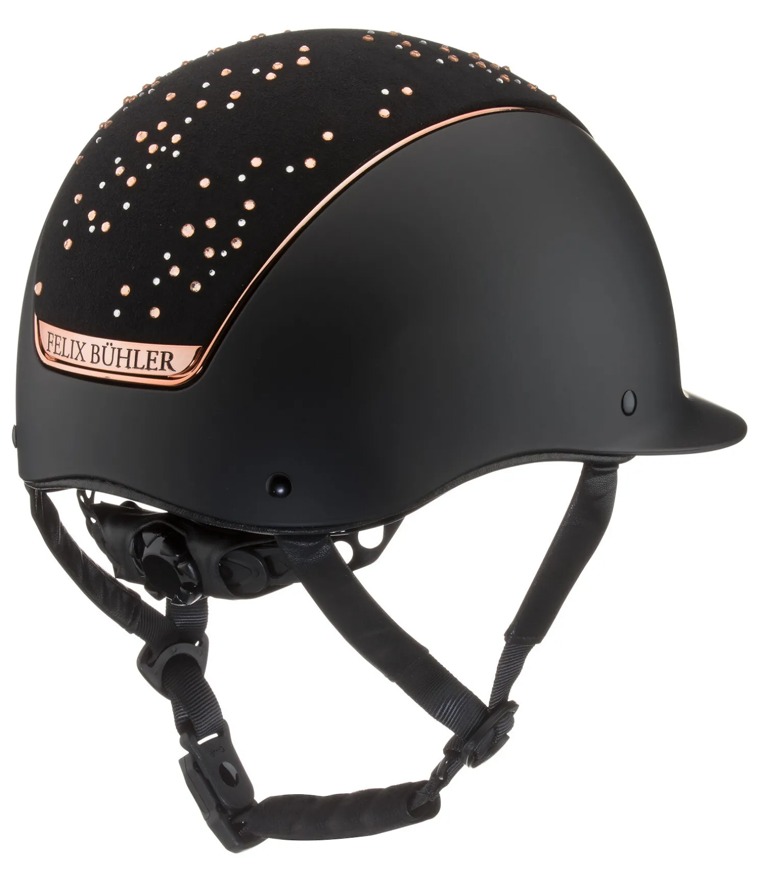 Casque d’équitation Felix Bühler haut de gamme avec décor de strass tel un ciel étoilé. Pour garantir un niveau de sécurité maximal, ce casque est doté de la technologie Hardshell avec une coque extérieure résistante aux chocs. Les ouvertures à l’avant assurent une aération optimale sur l’ensemble de la tête grâce à des canaux de ventilation internes passant de l’avant à l’arrière du casque. La doublure intérieure absorbant l’humidité est amovible et lavable à 30°C. Le casque dispose d’une fermeture magnétique innovante pour une ouverture à une seule main, facile et rapide. Grâce à la fonction Easy-Lock/No-Unlock, l’aimant verrouille l’attache dès que la boucle est approchée du fermoir. L’ouverture accidentelle du fermoir en tirant ou en tournant la boucle est impossible. Celle-ci peut être déverrouillé uniquement en appuyant fermement sur le bouton Unlock situé sur le côté. La molette à l’arrière du casque offre un ajustement précis et individuel, au millimètre près, à la circonférence de la tête. Les sangles recouvertes soulignent le design raffiné du casque et disposent de coussinets au niveau de la nuque et du menton pour garantir un confort de port optimal au cavalier. Ce casque d’équitation est certifié selon la norme EN1384:2023.