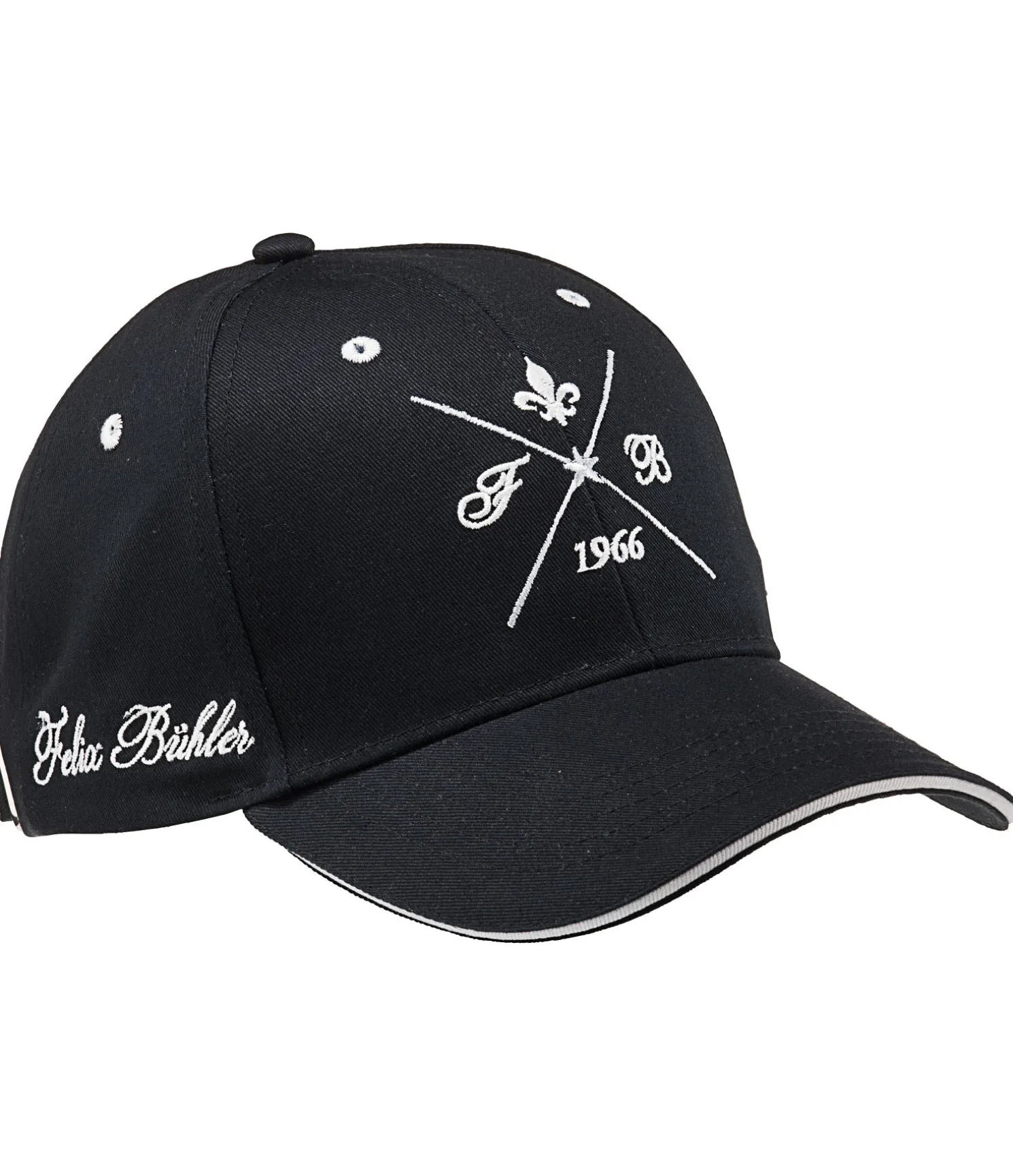 Casquette classique assortie à la collection Felix Bühler actuelle. Broderie à l’avant et sur les côtés. Trous d’aération, tour de tête réglable. 100 % coton.
