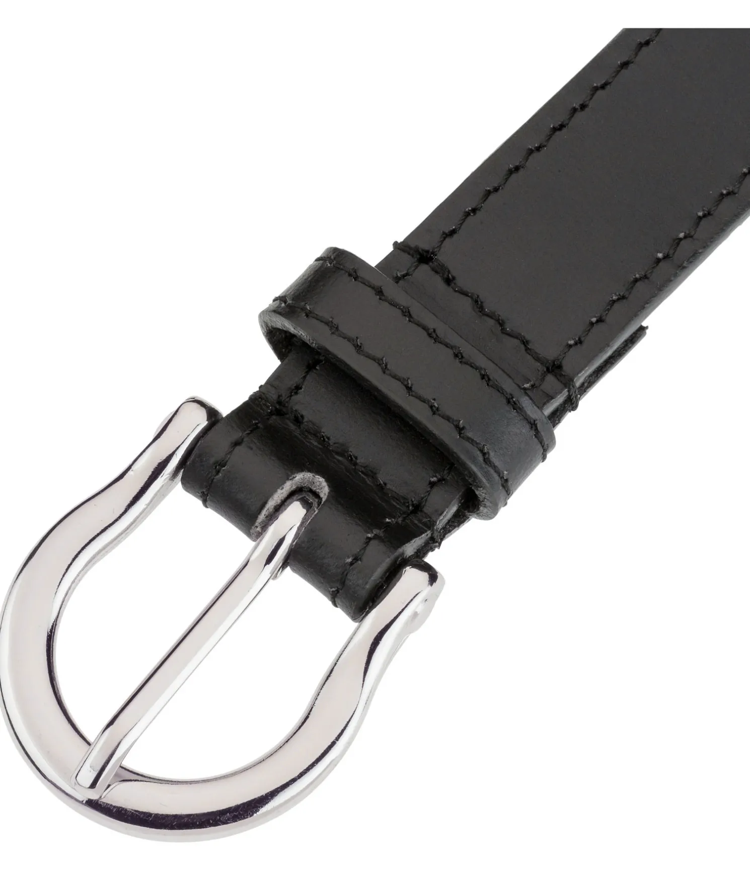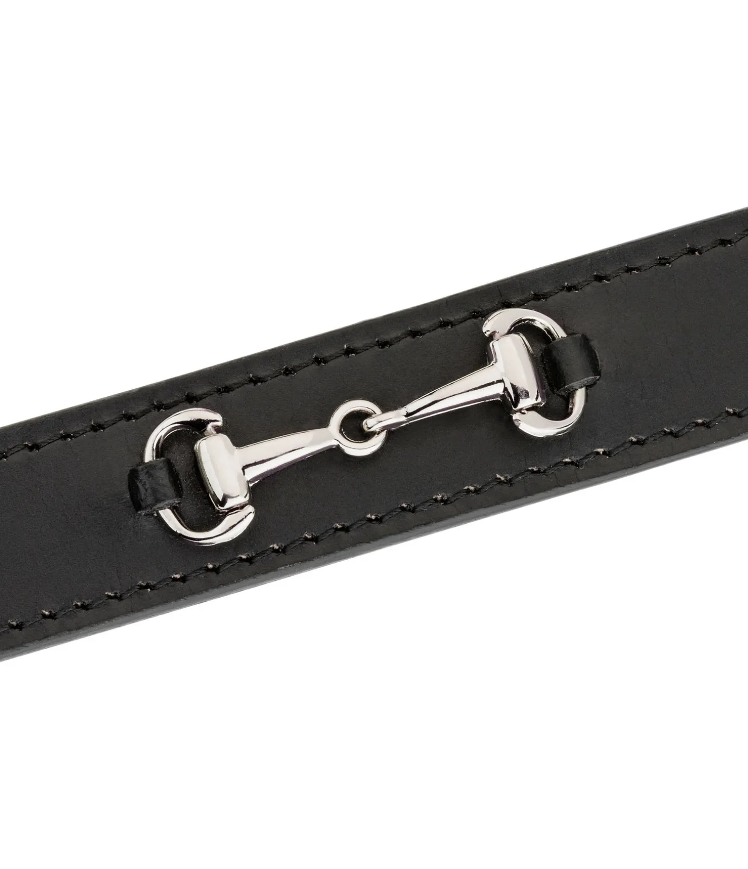 Élégante ceinture en cuir véritable. Motifs de petit mors sur toute la longueur. Coloris noir et marron avec boucle et mors argentés et coloris navy avec boucle et mors rose doré. Largeur 2,5 cm.