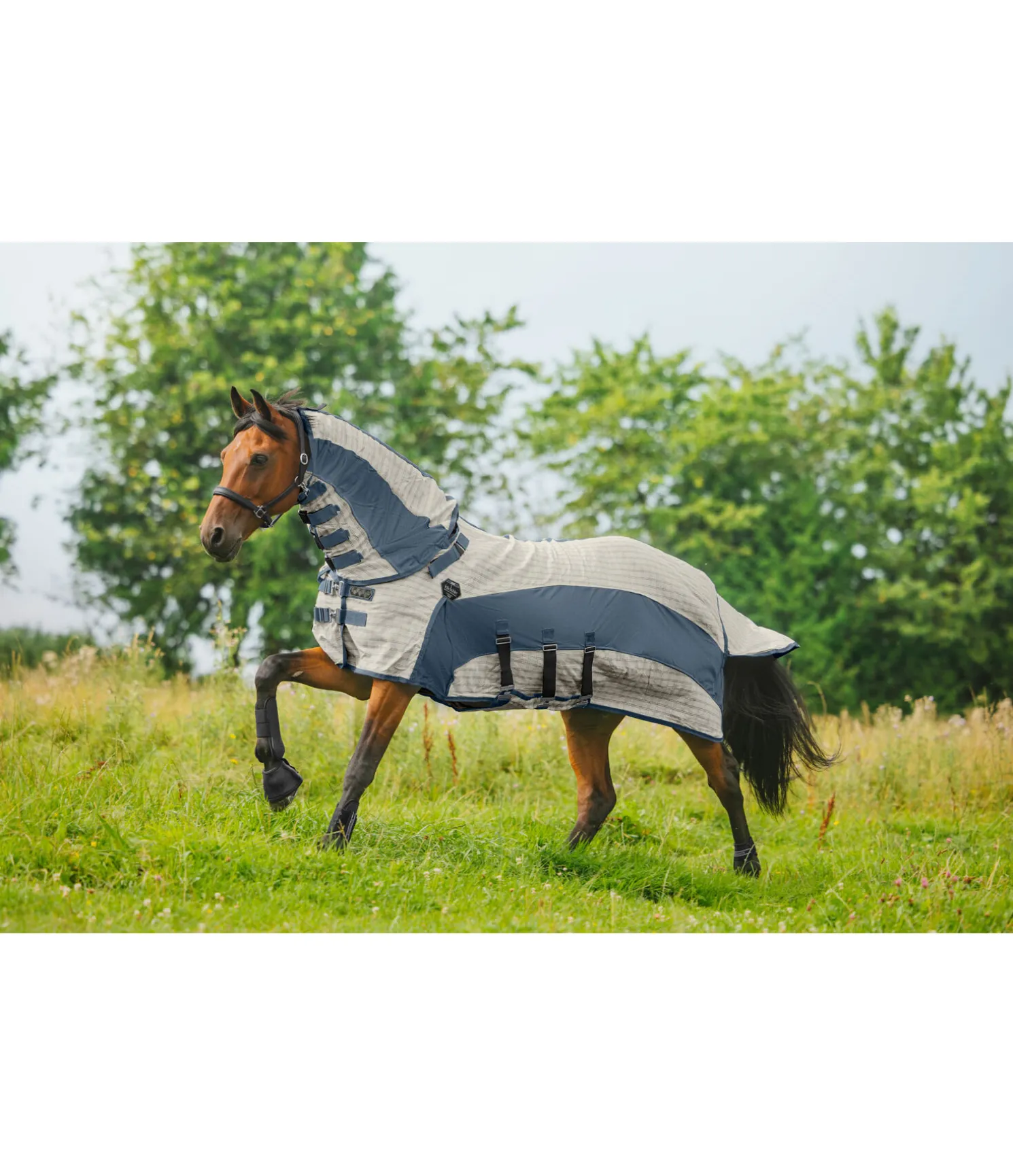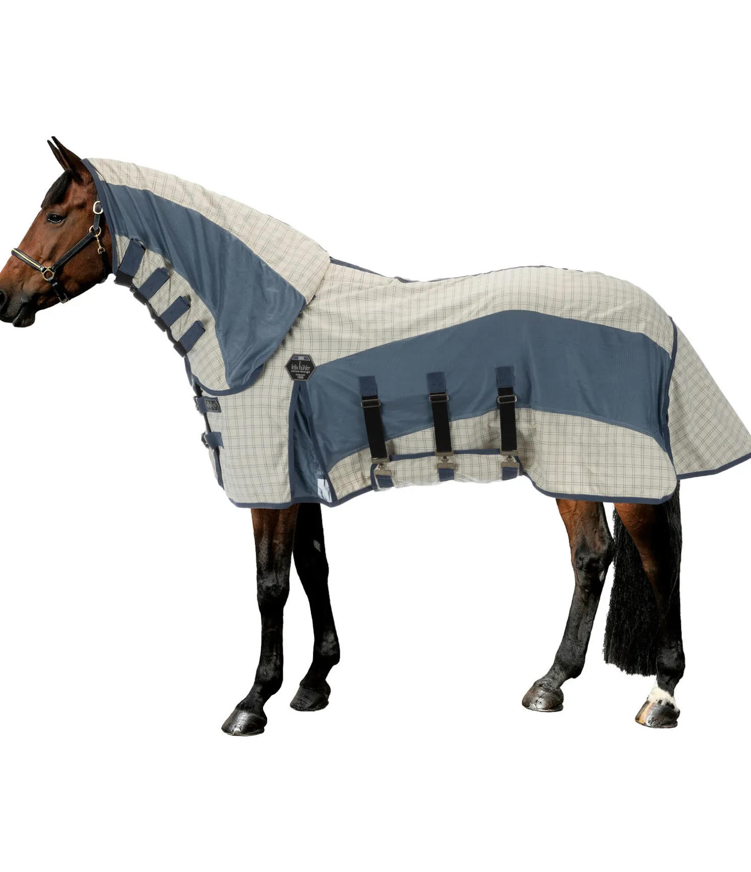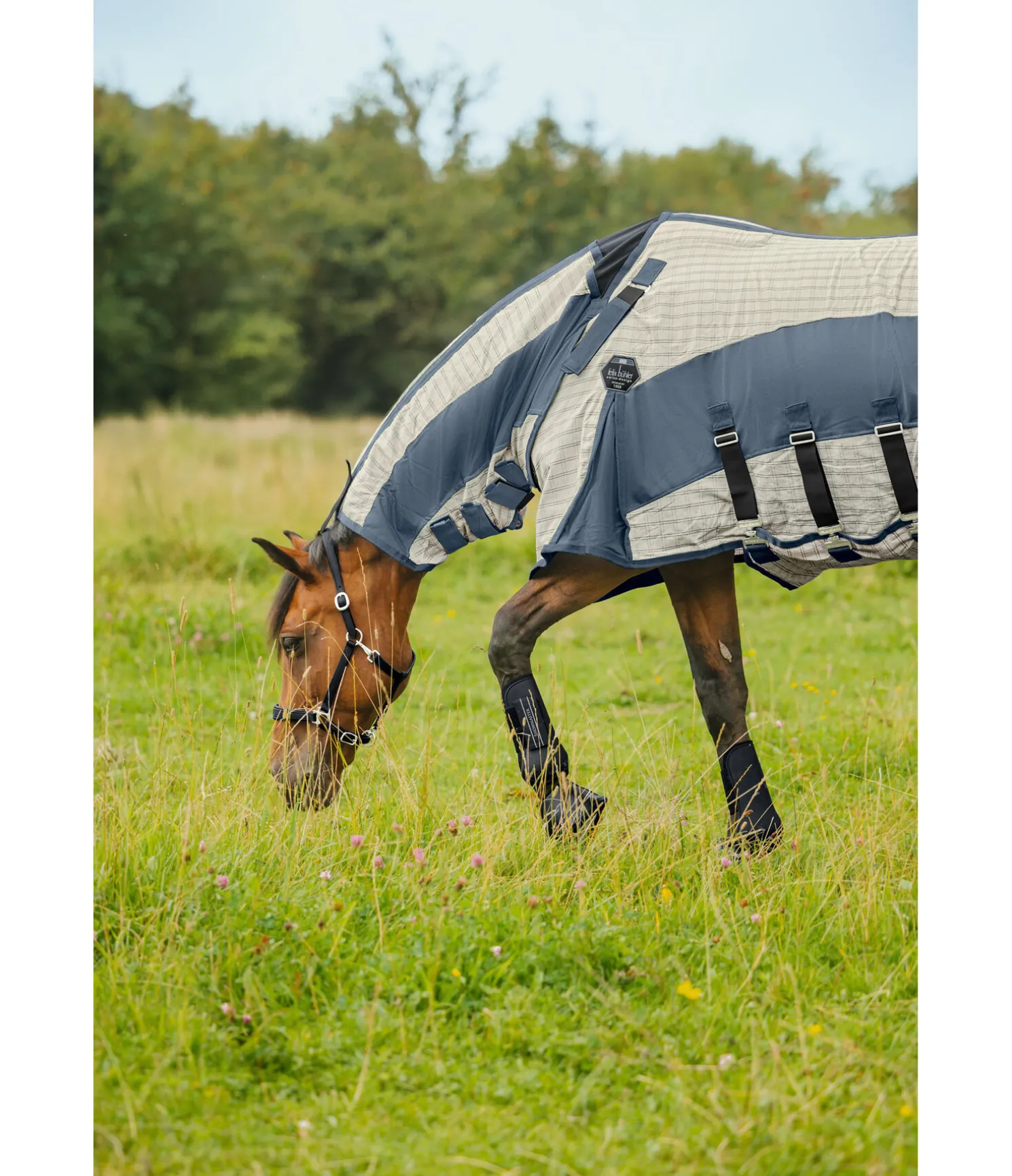 Chemise anti-mouches et anti-eczéma innovante et respirante en matière à base de coton (maille Ripstop 450 deniers, protection UV 90% + ), couvre-cou cousu avec boucle auto-agrippante élastiquée permettant de le fixer à la têtière du licol. Généreux plis d’aisance aux épaules et empiècement extensible à la base de l’encolure pour une liberté de mouvement optimale à toute les allures et permettant de ne pas gêner le cheval lorsqu’il baisse la tête. Réglable aux épaules grâce à une patte auto-agrippante de chaque côté, permettant d’adapter la couverture à la morphologie du cheval. Rabat ventral avec trois sursangles élastiques réglables, grand rabat de queue. Le taux élevé de coton dans le tissu permet de faciliter l’évacuation de l’humidité due à la transpiration du cheval. Empiècement central en mesh de chaque côté de l’encolure et sur les flancs pour assurer une bonne circulation de l’air. Fermeture de poitrail avec crochet en T et courroie de queue réglable. Anneaux pour fixer des courroies de cuisses (non fournies). Tissu à carreaux 52 % polyester, 48 % coton, mesh 100 % polyester.