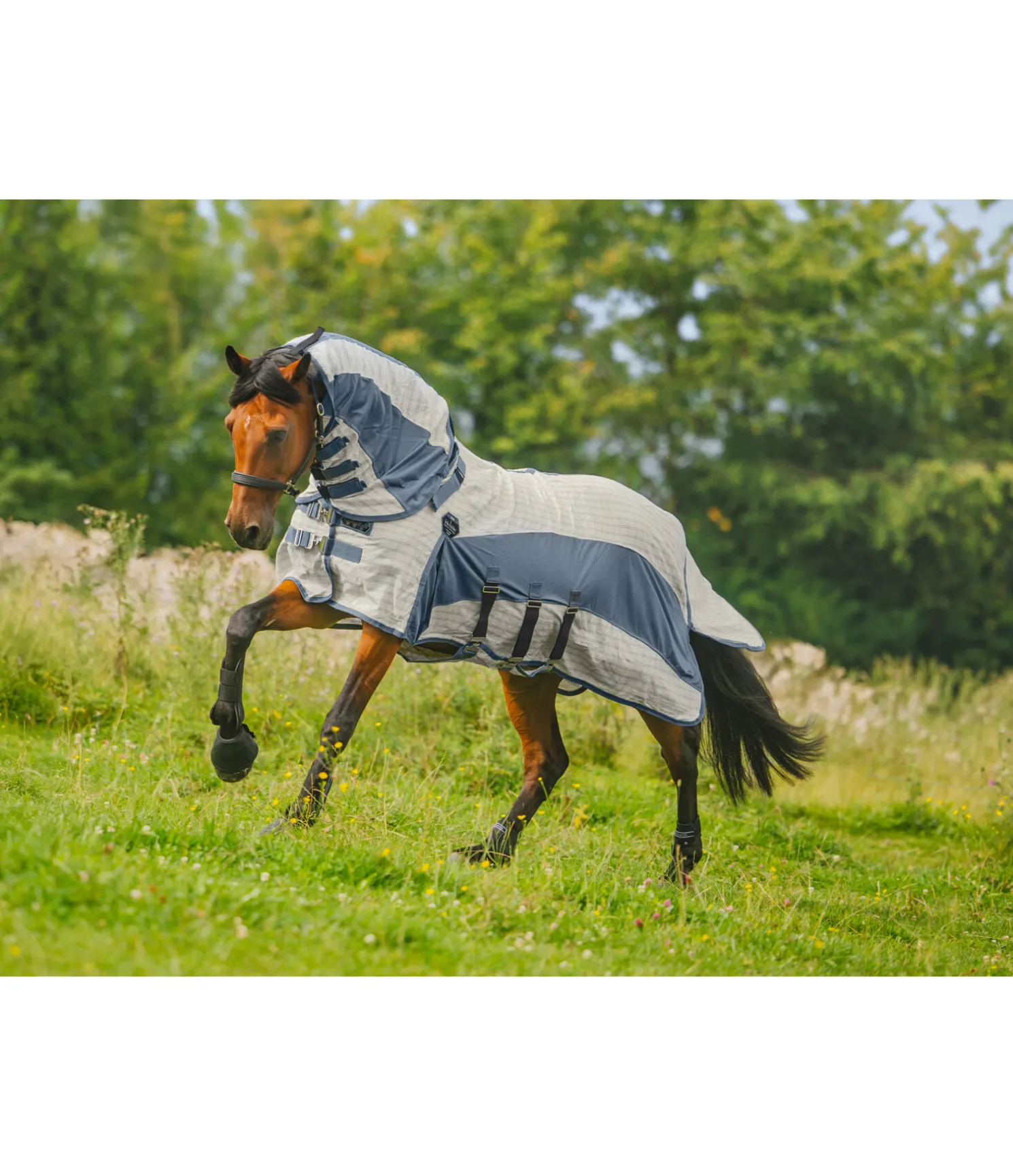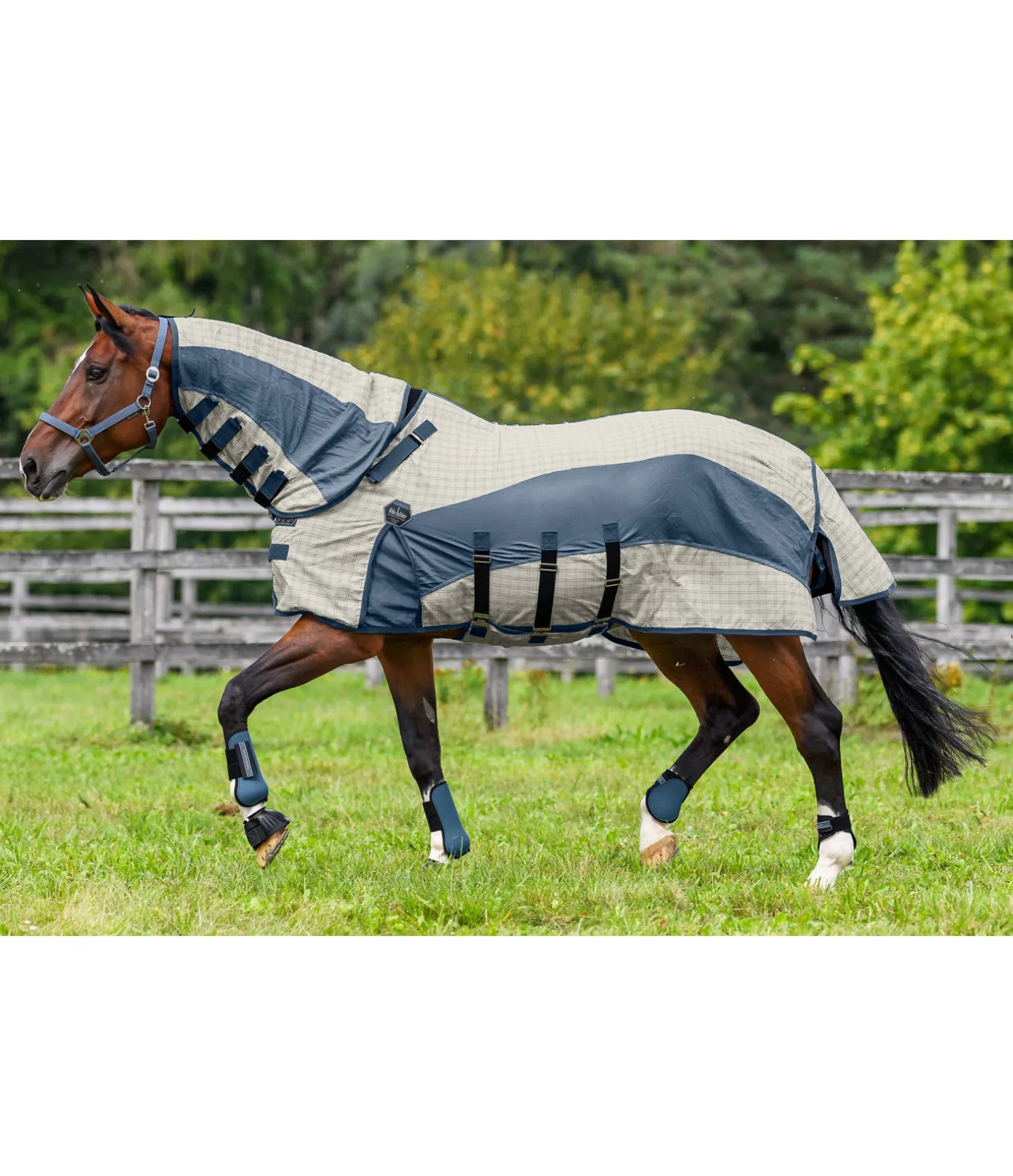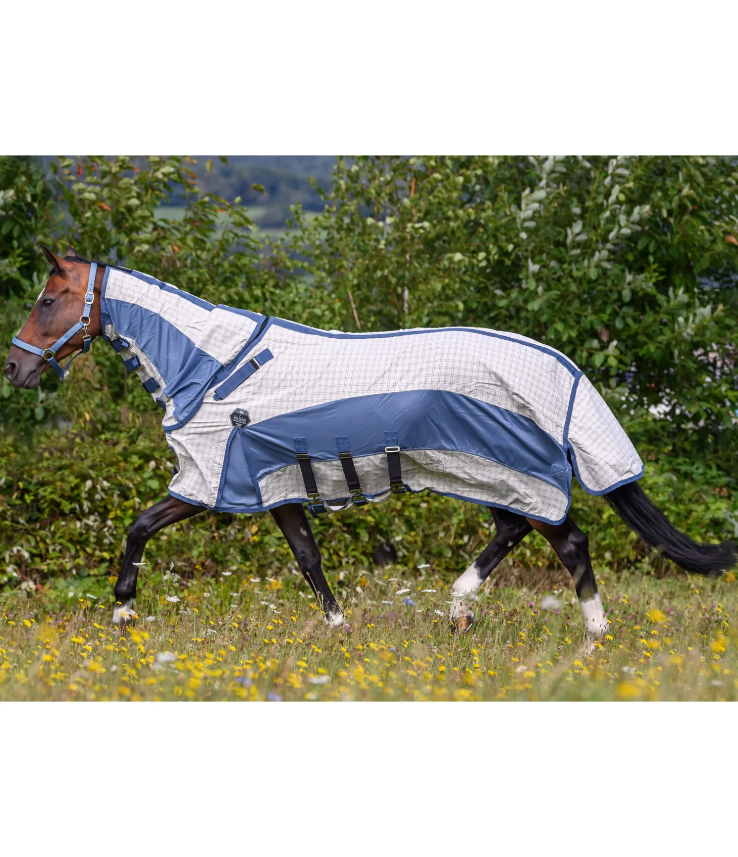 Chemise anti-mouches et anti-eczéma innovante et respirante en matière à base de coton (maille Ripstop 450 deniers, protection UV 90% + ), couvre-cou cousu avec boucle auto-agrippante élastiquée permettant de le fixer à la têtière du licol. Généreux plis d’aisance aux épaules et empiècement extensible à la base de l’encolure pour une liberté de mouvement optimale à toute les allures et permettant de ne pas gêner le cheval lorsqu’il baisse la tête. Réglable aux épaules grâce à une patte auto-agrippante de chaque côté, permettant d’adapter la couverture à la morphologie du cheval. Rabat ventral avec trois sursangles élastiques réglables, grand rabat de queue. Le taux élevé de coton dans le tissu permet de faciliter l’évacuation de l’humidité due à la transpiration du cheval. Empiècement central en mesh de chaque côté de l’encolure et sur les flancs pour assurer une bonne circulation de l’air. Fermeture de poitrail avec crochet en T et courroie de queue réglable. Anneaux pour fixer des courroies de cuisses (non fournies). Tissu à carreaux 52 % polyester, 48 % coton, mesh 100 % polyester.
