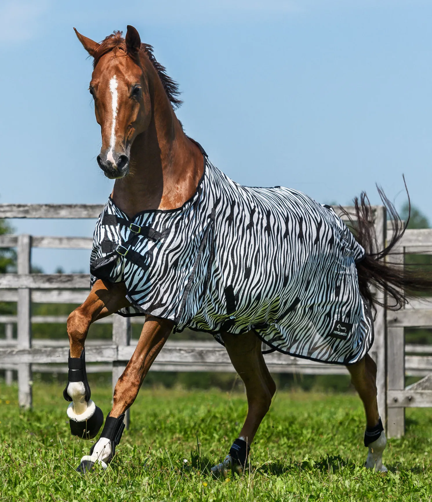 Chemise anti-mouches classique au look zèbre. Les motifs noir et blanc rendent les insectes incertains et les tiennent éloignés des chevaux. Double fermeture de poitrail. Plis d’aisance, rabat de queue et sursangles croisées. Doublure en nylon au niveau du poitrail pour limiter les frottements et la perte de poils. 100 % polyester.