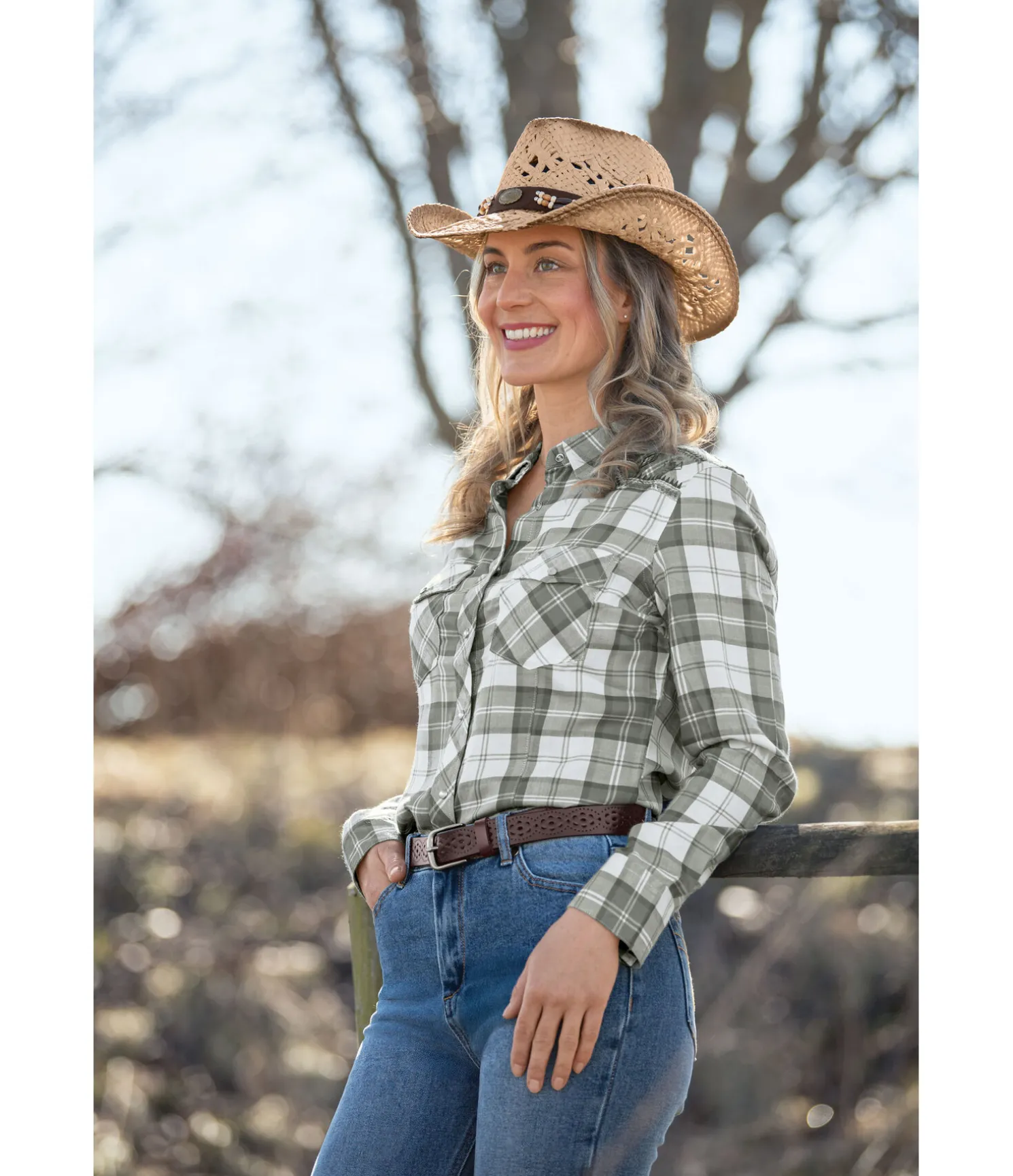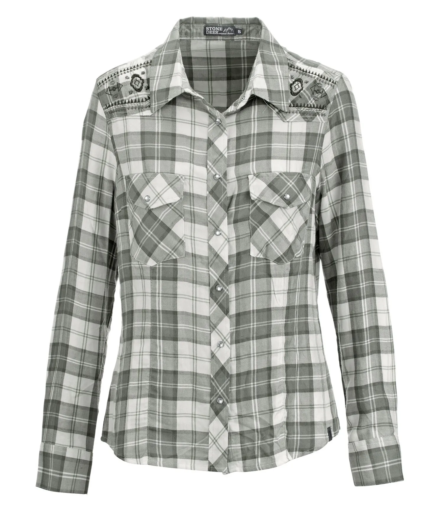 Chemise à carreaux. Coupe droite. Deux poches plaquées sur la poitrine. Patte de boutonnage et bas des manches avec boutons-pression nacrés. Yoke western brodé avec motif aztèque. Matière respirante. 100 % viscose.