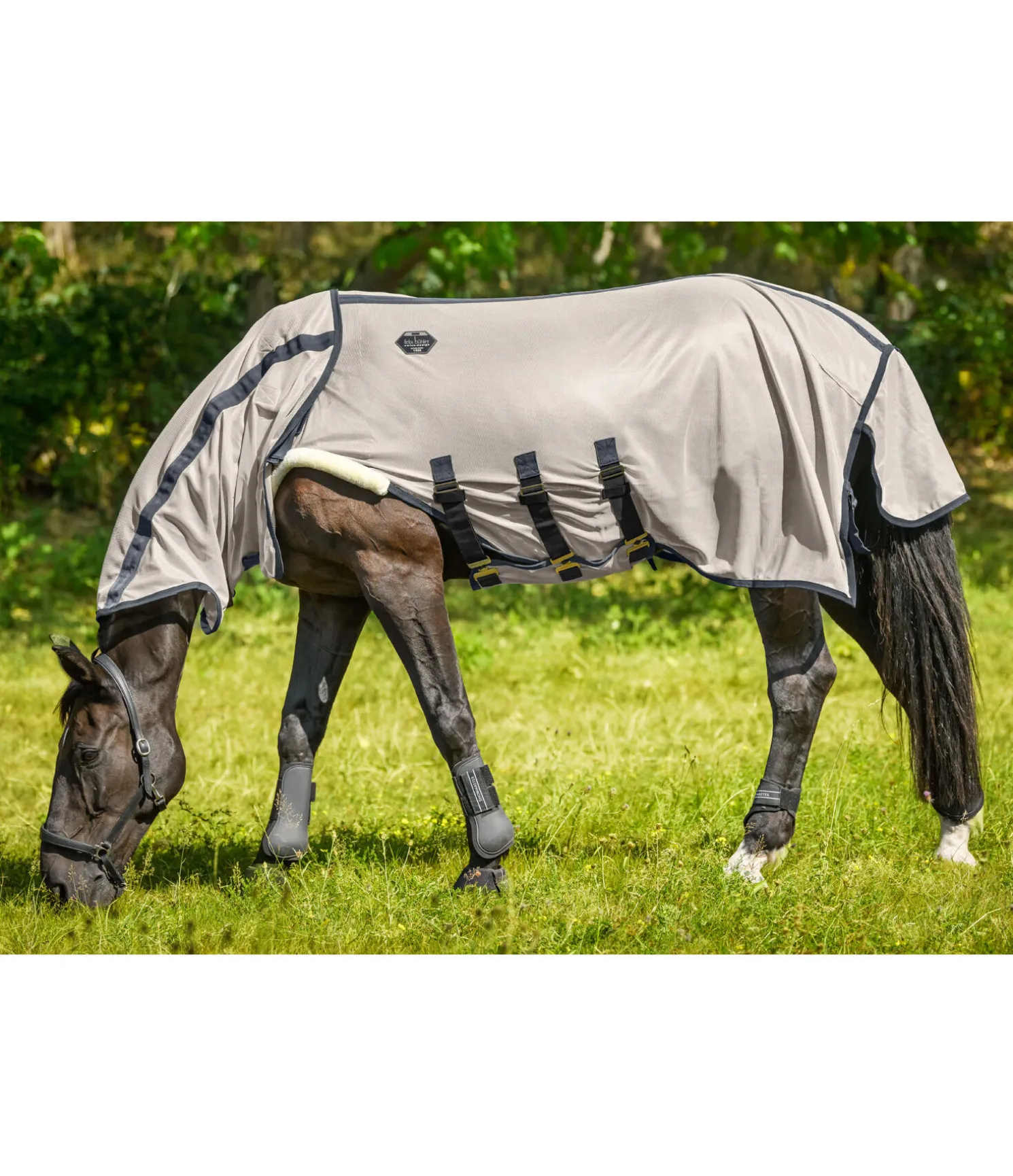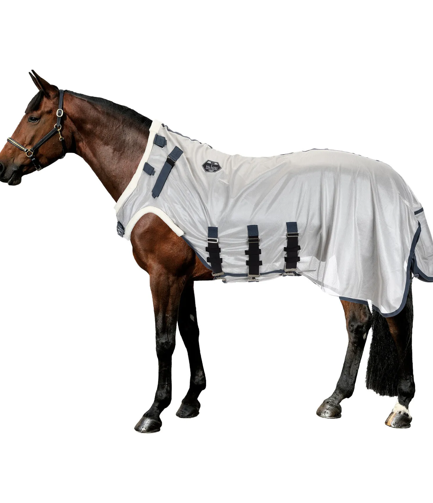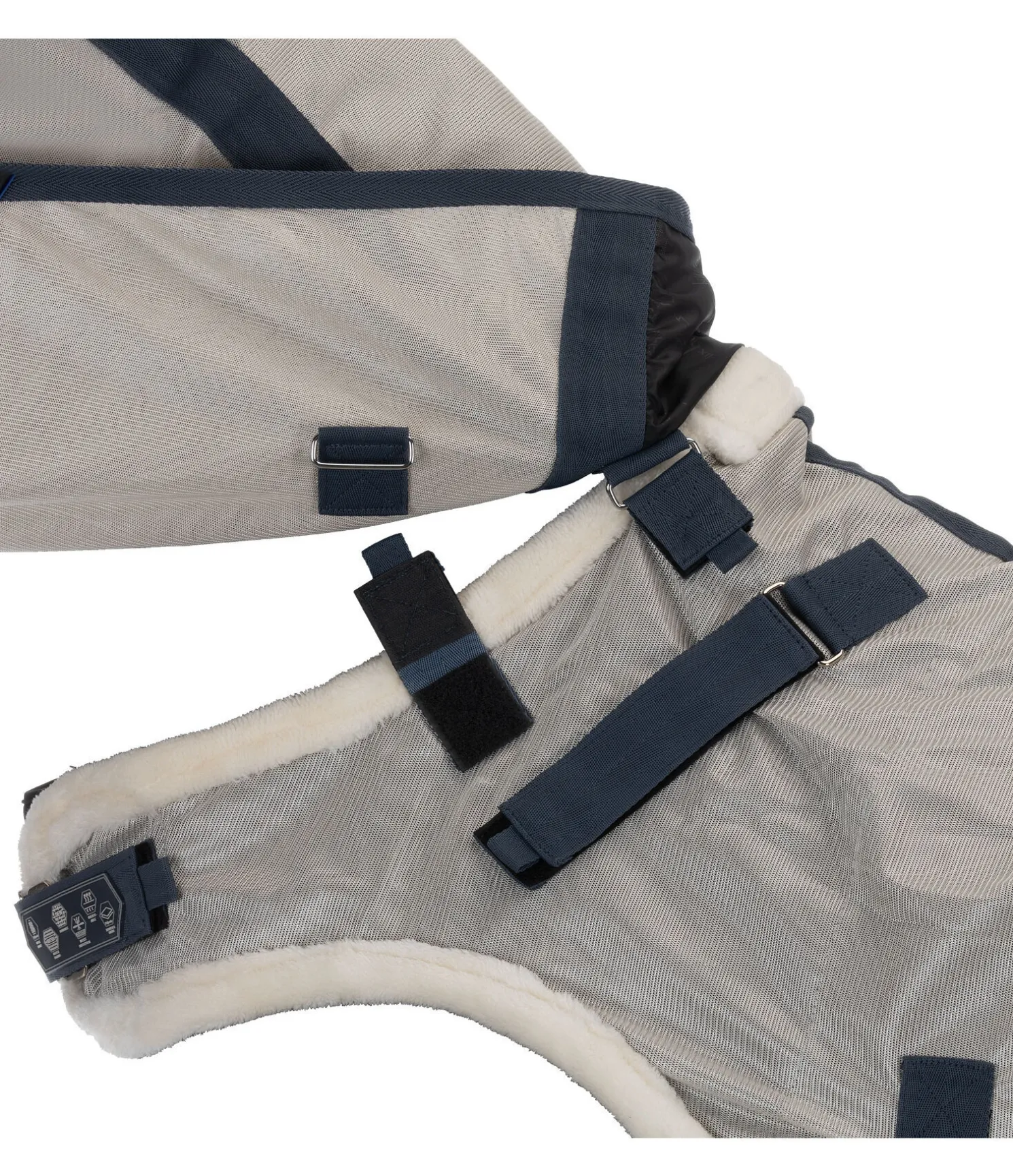 Chemise de marcheur anti-mouches premium en mesh respirant. Rabat ventral réglable avec sursangles élastiques et couvre-cou amovible avec boucle auto-agrippante élastiquée permettant de le fixer à la têtière du licol. Ouverture pour l’encolure et découpe aux antérieurs avec bordure en polaire Teddy douce pour un confort optimal. Fermeture de poitrail avec crochet en T dissimulée et doublée en caoutchouc chloroprène pour éviter les pressions et les irritations dues aux frottements. Pad de garrot en polaire Teddy douillette. Réglable aux épaules grâce à une patte auto-agrippante de chaque côté, permettant d’adapter la chemise à la morphologie du cheval. Doublure lisse satinée dans la zone des épaules, du poitrail, de l’encolure et de la queue. Avec rabat de queue et courroie de queue réglable. 100 % polyester.