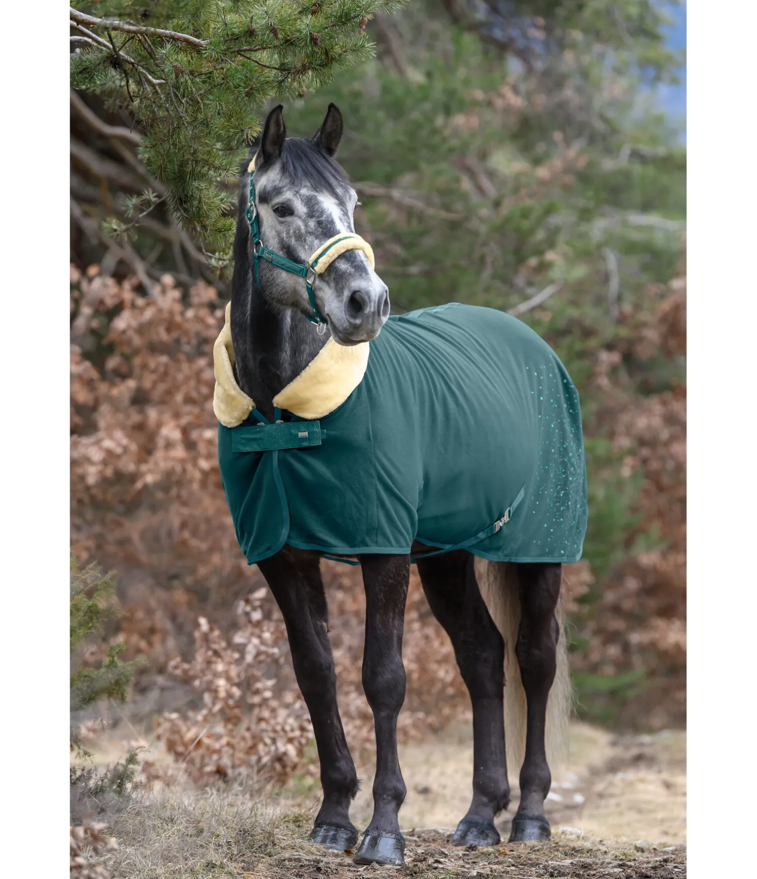 Chemise séchante chaude et douce avec col rembourré en polaire Teddy. Joli imprimé scintillant sur la partie arrière gauche de la couverture. Doublure lisse protégeant la robe au niveau des épaules et du poitrail, pour éviter les irritations dues aux frottements. Sursangles croisées amovibles de chaque côté. Fermeture de poitrail dissimulée avec crochet en T. Courroie de queue réglable incluse. Bouclerie argentée pour la couleur S et GA et rose doré pour la couleur NV. 100 % polyester.