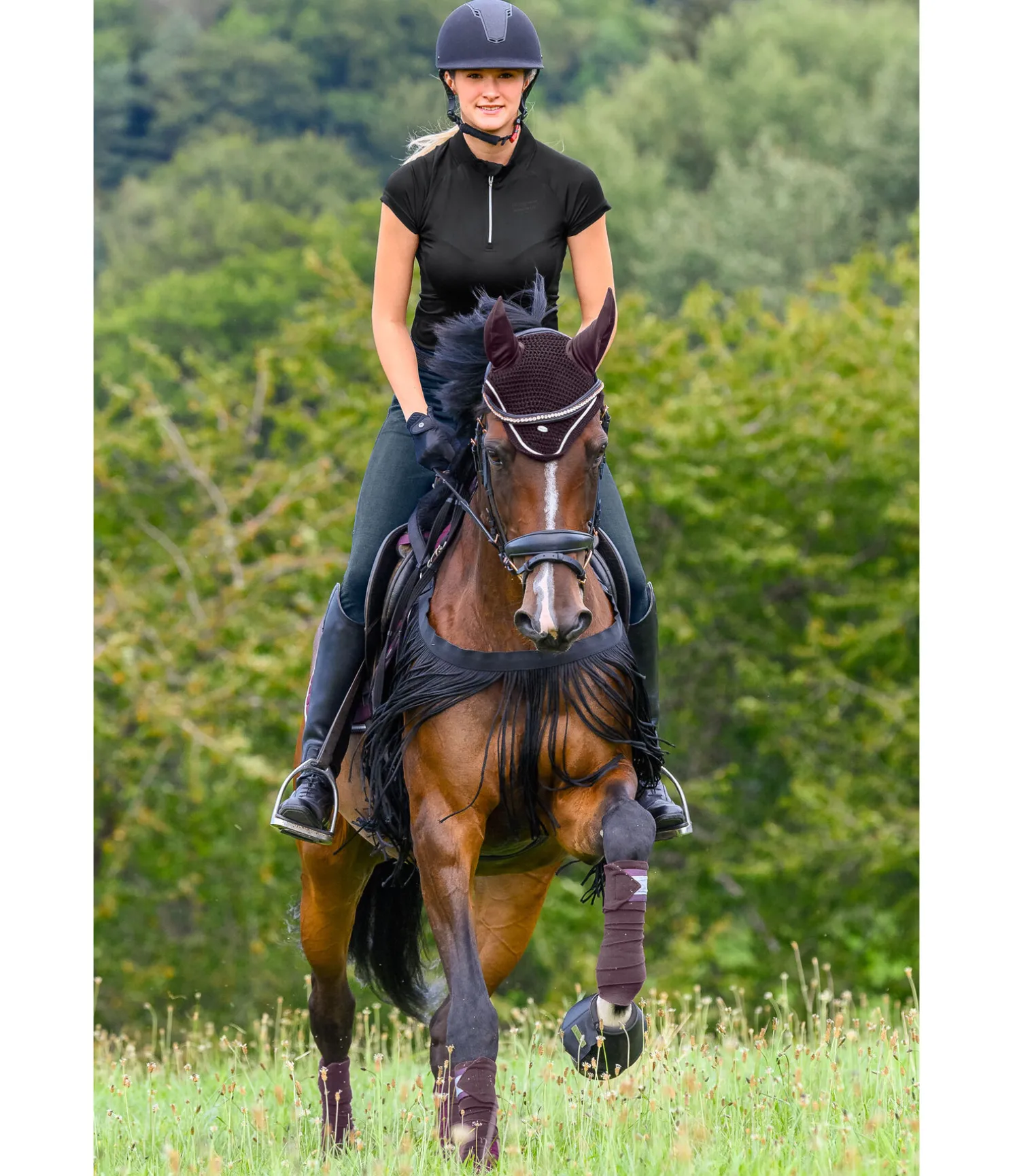 Collier de chasse innovant qui protège des mouches grâce à sa généreuse frange anti-mouches au niveau du poitrail et des épaules, pour des balades ou le travail au sol ou à la longe en toute tranquillité. Une bande élastique réglable passe au garrot pour un meilleur maintien et des clips simples en métal avec pattes auto-agrippantes permettent la fixation aux oeillets de la selle ou du surfaix. La bande est élastique sur tout le long. Alternative légère et parfaite à la couverture anti-mouches. 100% polyester.
