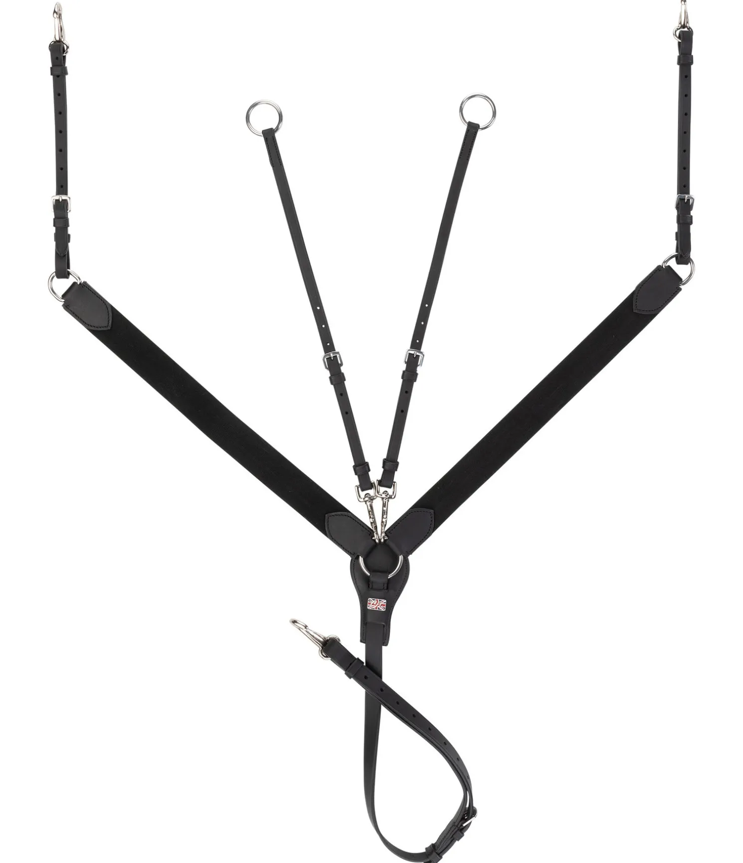 Collier de chasse fonctionnel en cuir gras. Longs empiècements élastiques des deux côtés et point de poitrine sur le poitrail avec doublure douce pour une meilleure répartition des pressions. Empêche la selle de glisser vers l’arrière sans gêner les mouvements du cheval. 3 points d’attache avec mousquetons pour une mise en place facile et rapide. Utilisable dans plusieurs disciplines grâce aux nombreux réglages possibles. Fourche de martingale amovible. Bouclerie argentée.