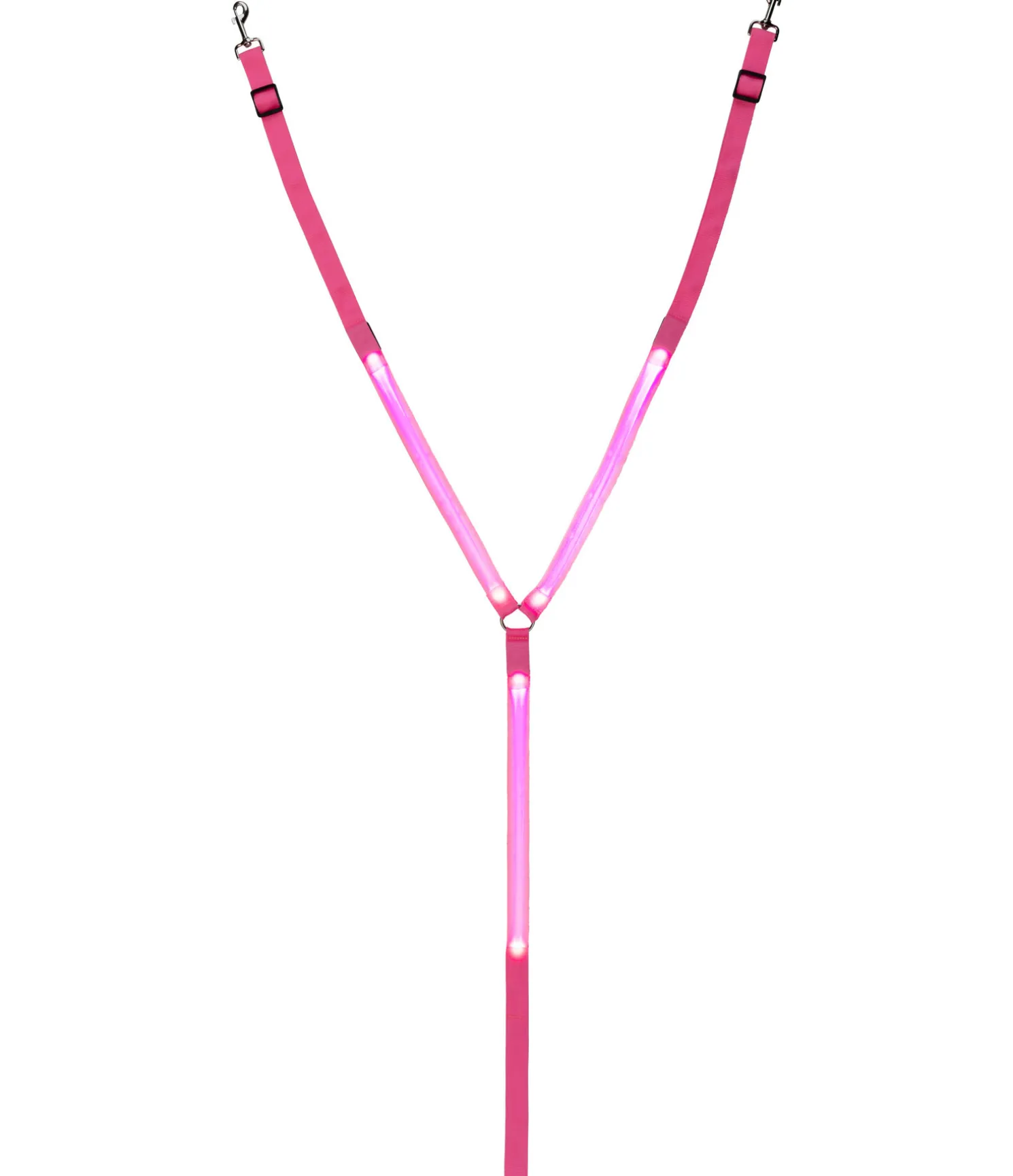Collier de chasse lumineux fonctionnel avec boucle pour le fixer à la sangle et 2 mousquetons pour le fixer à la selle. 3 fonctions lumineuses différentes sur les 3 bandes concernées. Réglable de double-poney à cheval. Rechargeable par USB.