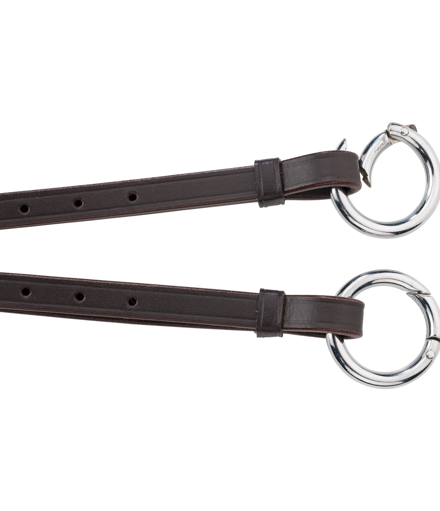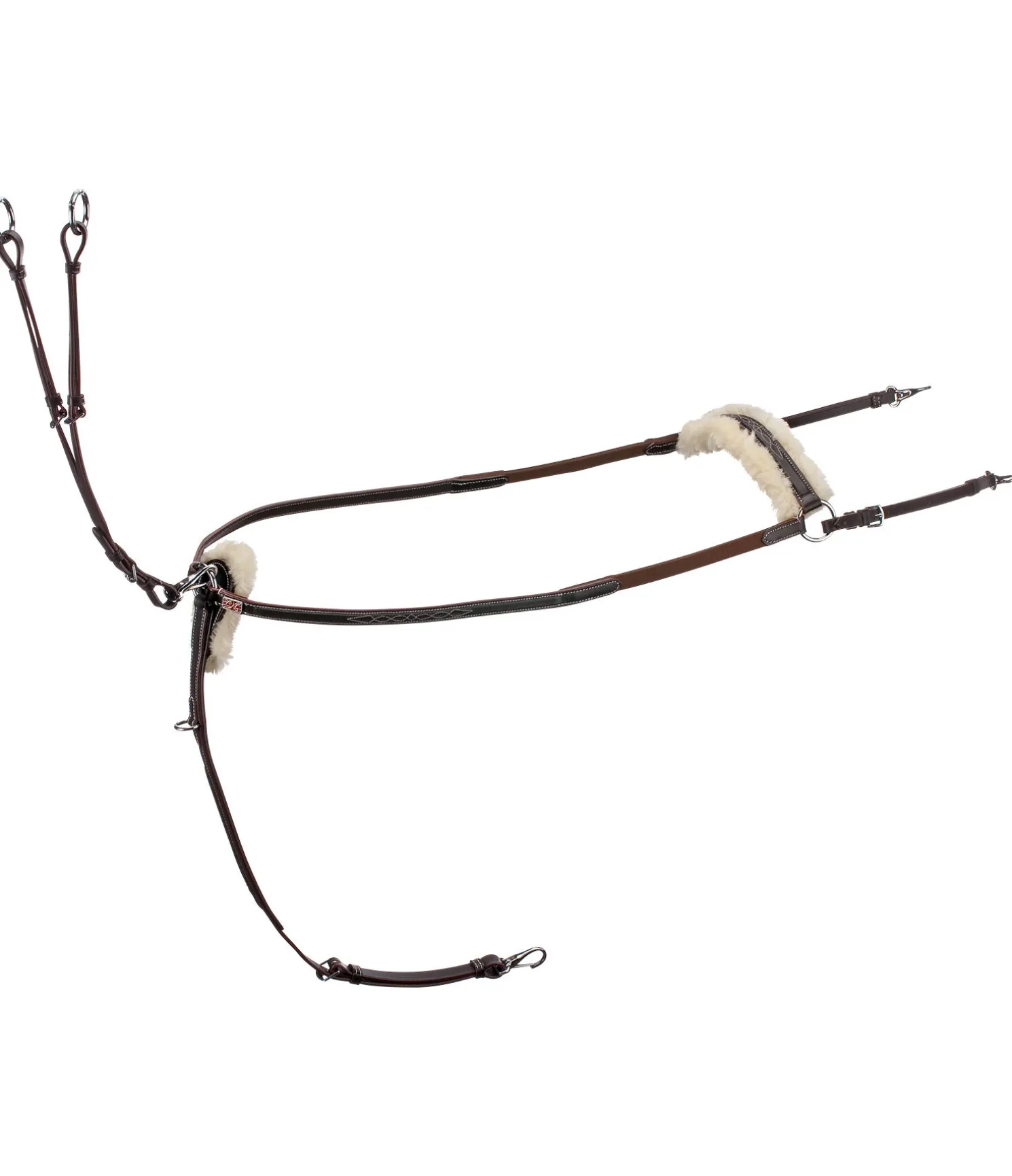 Collier de chasse élégant. Taille ajustable grâce aux élastiques. Cuir véritable haut de gamme avec surpiqûres de couleur contrastante. Rembourrages amovibles en polaire Teddy sur les points de pression au poitrail et au garrot. Fourche de martingale réglable et amovible. Anneaux de martingale ouvrables. Fixation rapide à la selle grâce à des mousquetons pratiques. Bouclerie argentée.