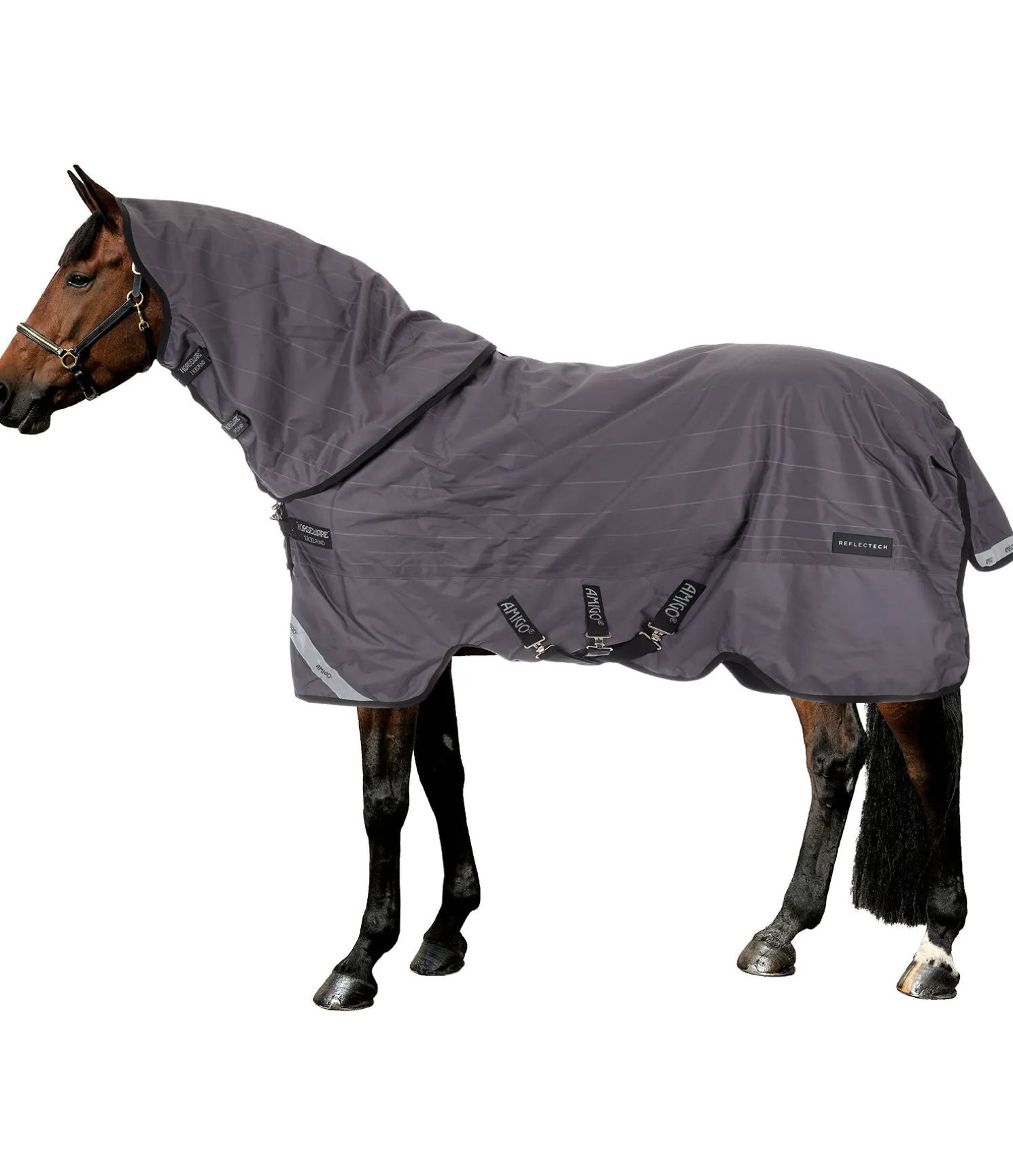 Couverture d’extérieur robuste, résistante à la déchirure, imperméable et respirante (1 200 deniers) avec grammage chaud 100 g. Couvre-cou amovible avec garnissage en fibres polyester. Pour plus de sécurité grâce à une meilleure visibilité dans l’obscurité : passepoil réfléchissant et bandes réfléchissantes sur le poitrail et le rabat de queue. Doublure intérieure lisse en polyester pour éviter la casse des poils. Liberté de mouvement maximale grâce à l’encolure SureFit et son système de fermeture de poitrail en V et aux découpes innovantes au niveau des jambes qui permettent de parfaitement protéger le ventre. Possibilité de fixer des liners (420481 ou 420482) à l’aide d’oeillets pour augmenter le grammage de la couverture et l’adapter ainsi à toutes les conditions météorologiques. Trois sangles croisées pour une meilleure tenue de la couverture. 100% polyester.