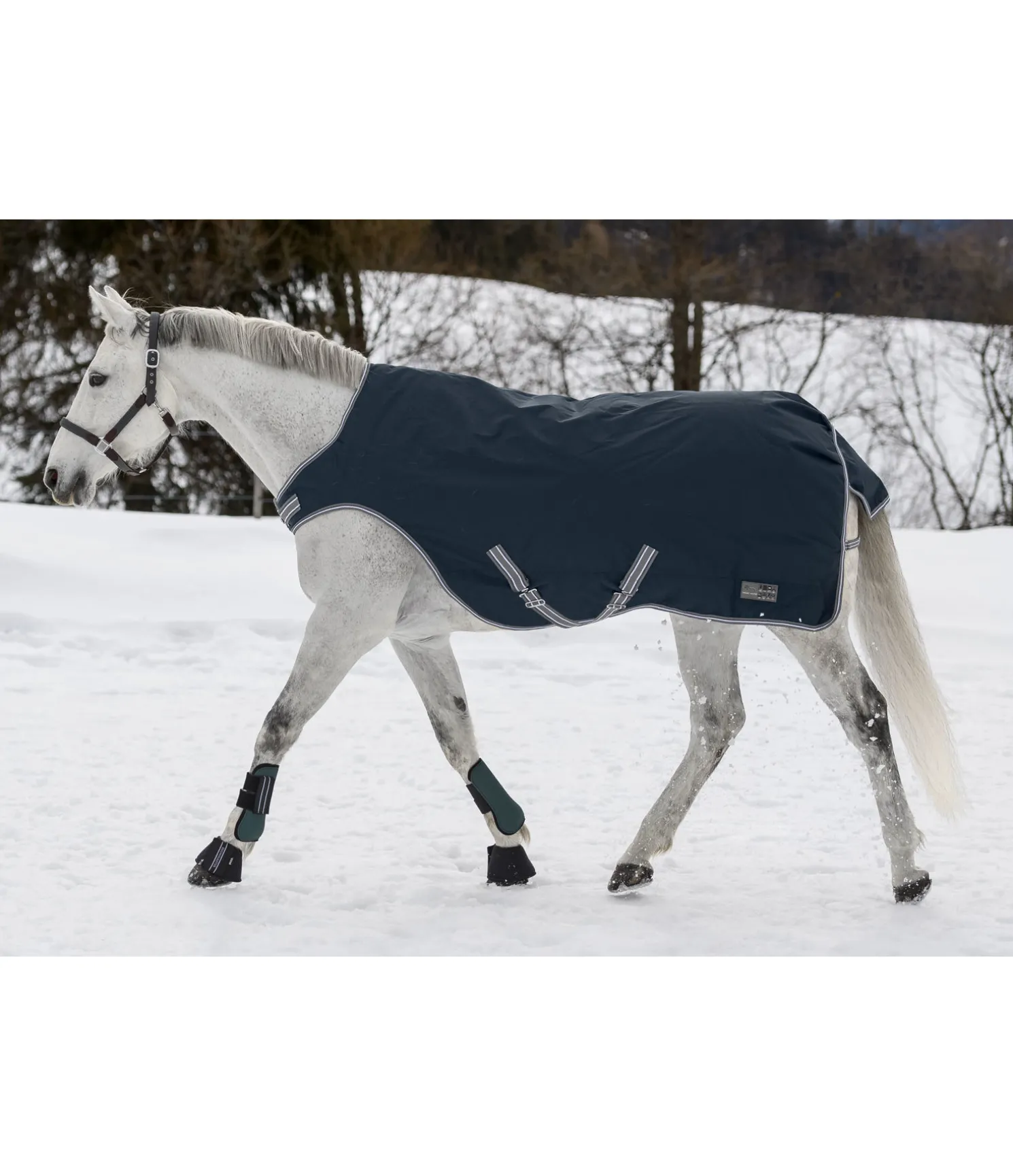 Pour une liberté de mouvement optimale : couverture de marcheur imperméable (3.000 mm) avec découpe au niveau de l’avant-main, en matière Ripstop 600 deniers avec garnissage 200g. Protège efficacement la zone des reins et les flancs du froid, de l’humidité et du vent. Idéale pour le marcheur et déplacements en main ainsi que pour longer. Fermeture de poitrail avec crochet en T et patte auto-agrippante supplémentaire, sursangles croisées réglables, rabat de queue et courroie de queue réglable. Doublure lisse protégeant la robe. 100 % polyester.