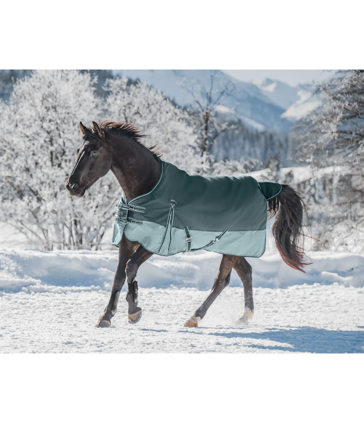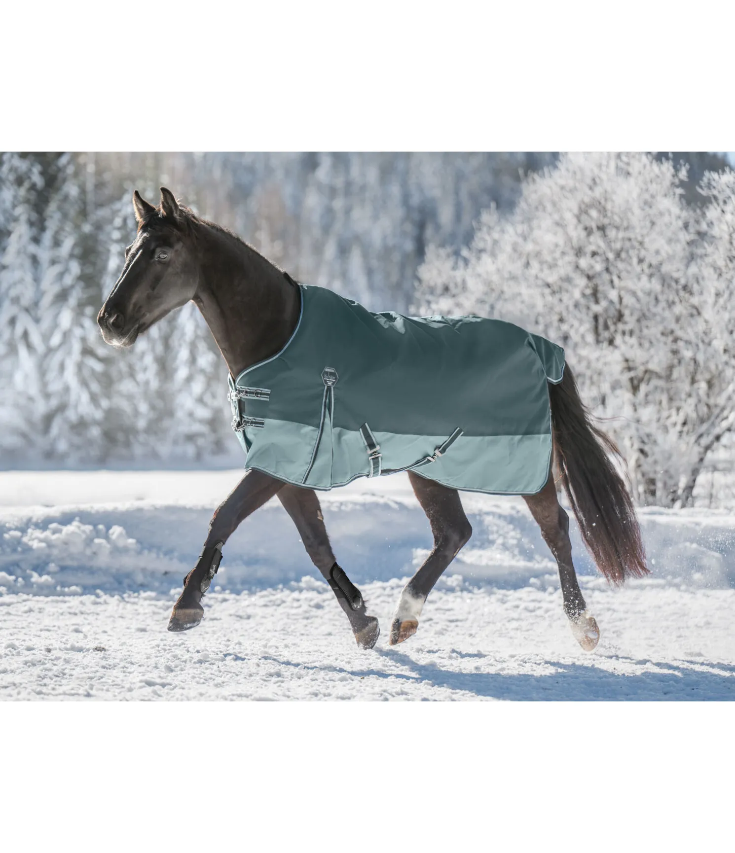 Couverture d’extérieur bicolore résistante et imperméable (3 000 mm) en matière Ripstop solide (1 200 deniers). Coussins au niveau du garrot pour le protéger et éviter les pressions. Garnissage 150 g apportant de la chaleur. Doublure lisse protégeant la robe. Double fermeture de poitrail réglable avec mousquetons et patte auto-agrippante supplémentaire pour un maintien sûr. Grands plis d’aisance pour une liberté de mouvement optimale. Sursangles croisées, anneaux permettant de fixer des courroies de cuisses (non incluses) et courroie de queue réglable. 100 % polyester.