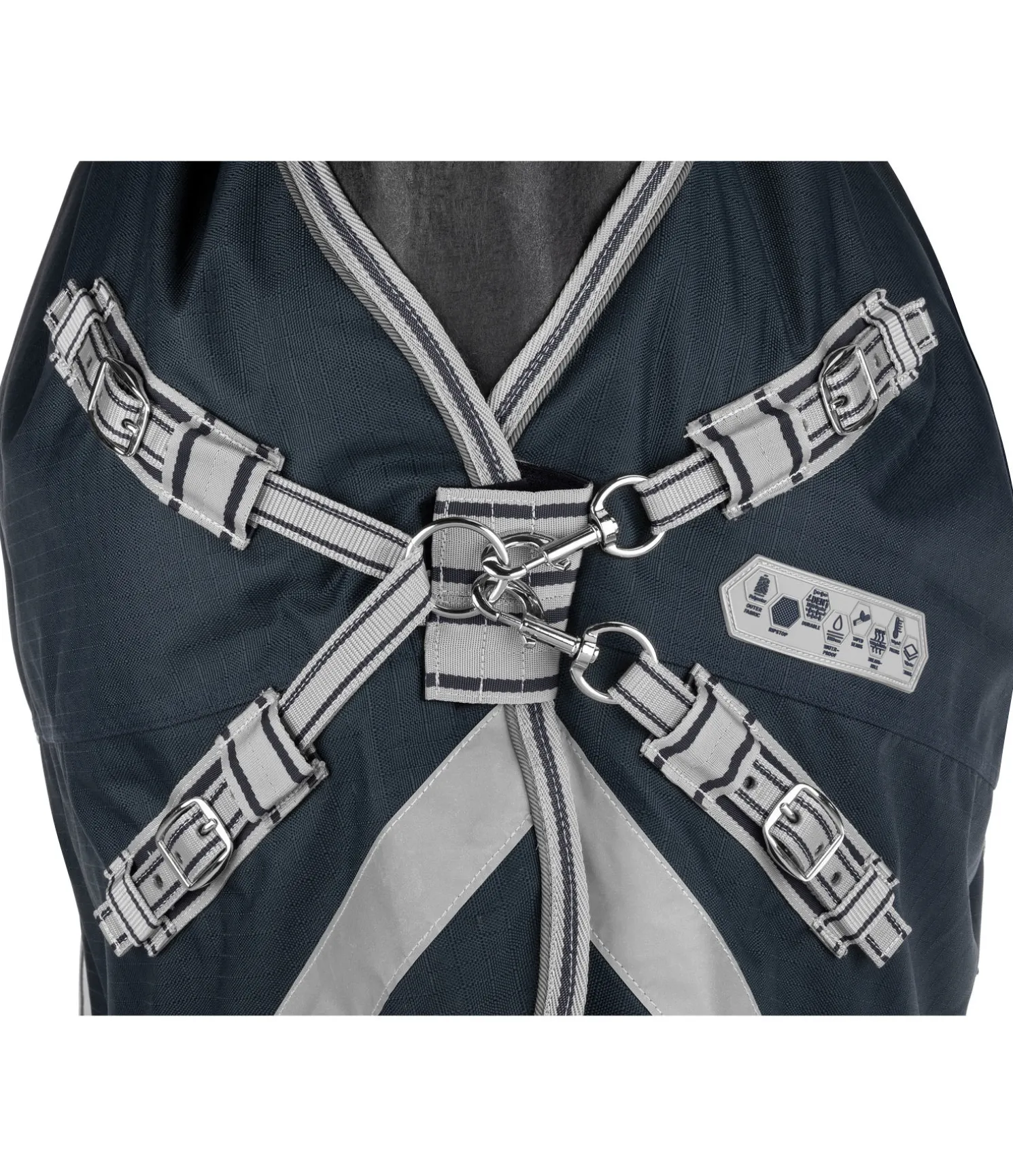 Chemise d’extérieur de grande qualité dans une coupe Highneck protectrice, en matière Ripstop 1.200 deniers particulièrement imperméable (5.000 mm), qui protège efficacement en cas d’averse. Garnissage 350 g chaud. Les nombreux éléments réfléchissants tels que le passepoil en bordure et les bandes sur le poitrail, l’arrière-main et le rabat de queue assurent une bonne visibilité et une sécurité optimale. Double fermeture de poitrail équilibrée en plusieurs points avec patte auto-agrippante supplémentaire, sursangles croisées réglables. Doublure lisse protégeant la robe. Anneaux permettant la fixation de courroies de cuisses (non incluses). Rabat de queue et courroie de queue réglable. 100 % polyester.