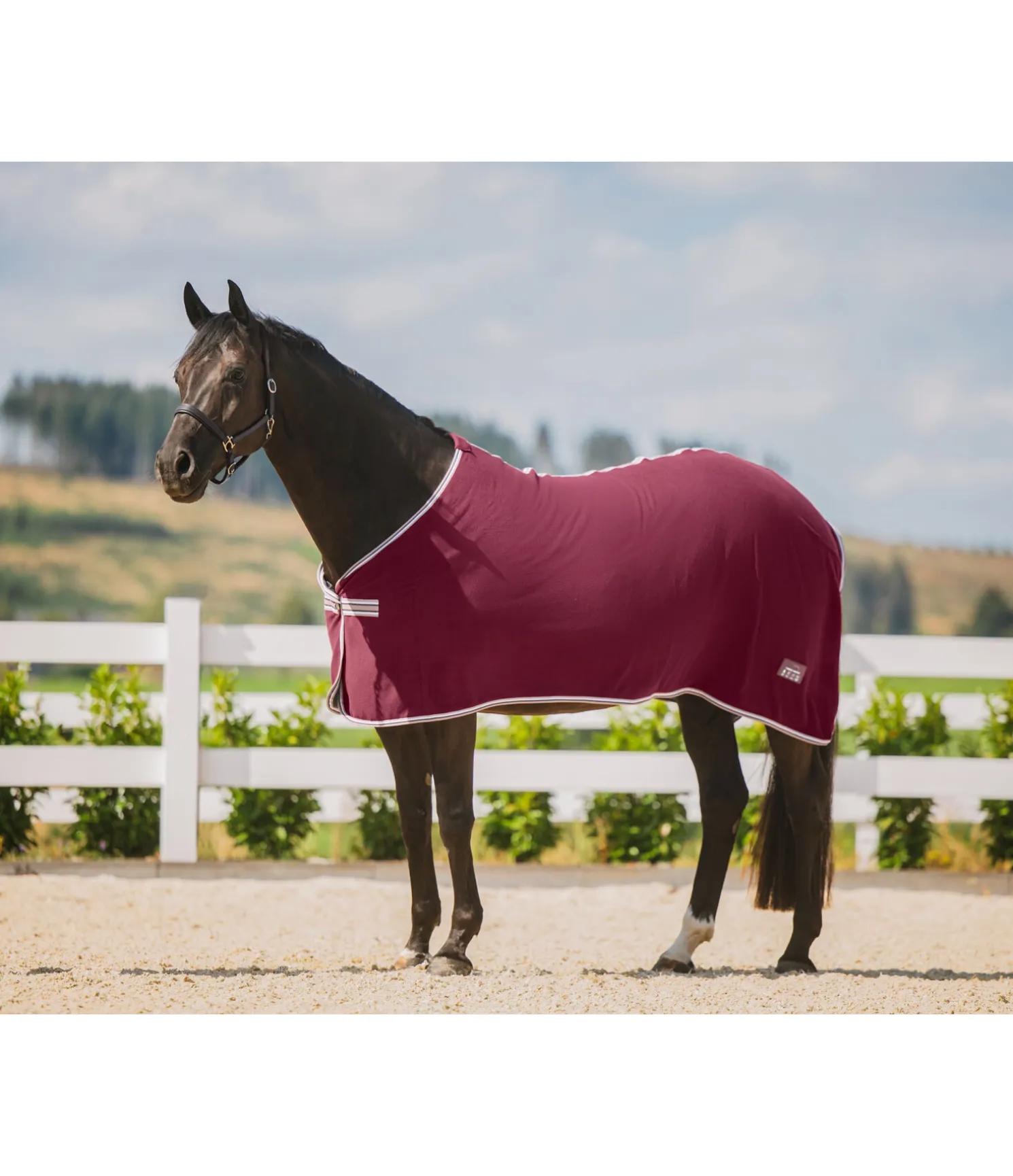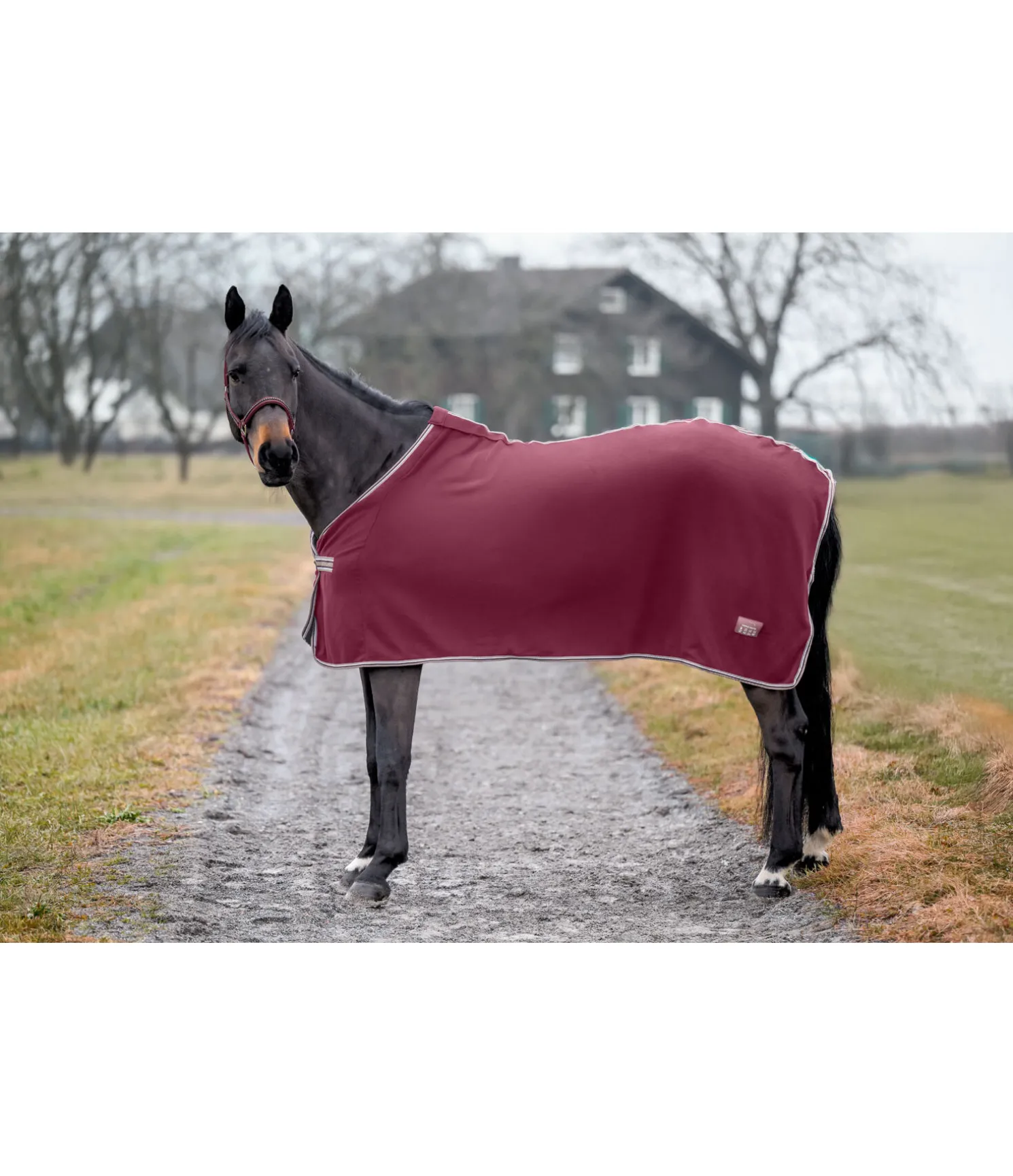 Couverture séchante en polaire, simple et élégante. Fermeture de poitrail avec crochet en T. Pad de garrot en polaire douce et doublure lisse satinée au niveau des épaules pour éviter la casse des crins et les irritations dues aux frottements. 100 % polyester.