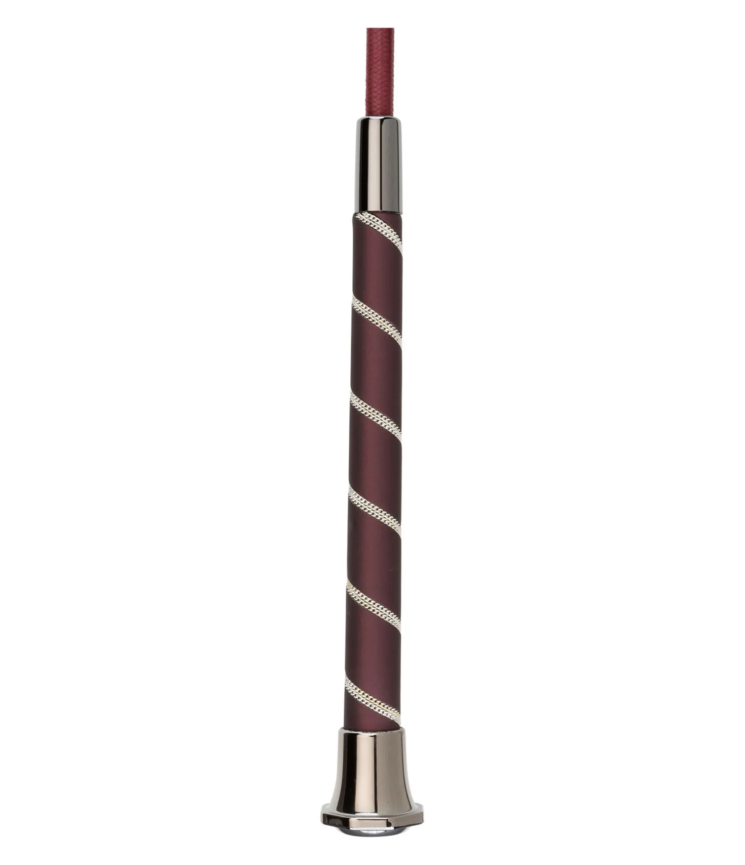 Cravache de dressage élégante avec poignée décorée d’un cordon torsadé argenté. Pommeau hexagonal avec badge logo. Tige en fibre de verre avec revêtement en nylon.