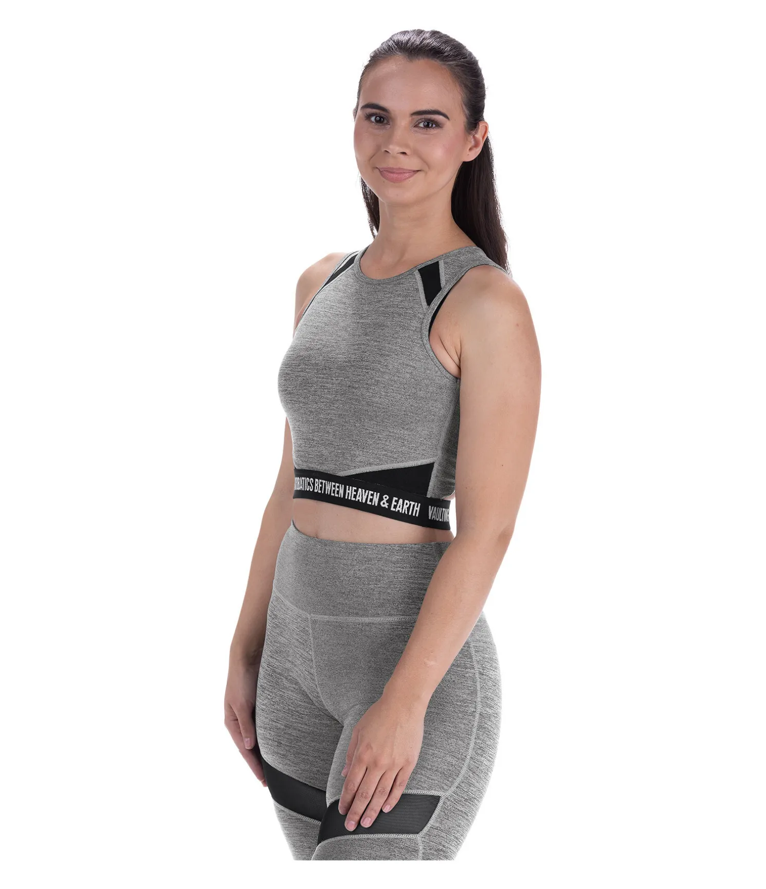 Crop top près du corps avec larges bretelles. Inserts en mesh, au niveau des côtes et des épaules, favorisant la circulation de l’air. Matière respirante et à séchage rapide. Brassière de sport intégrée avec coques amovibles pour un maintien optimal. Il est conseillé de retirer les coques avant le lavage. Bande élastiquée à la taille avec inscription brodée « Vaulting – Acrobatics between heaven & earth ». Découpe croisée travaillée dans le dos. 88 % polyester, 12 % élasthanne (carbone chiné) et 78 % polyester, 22 % élasthanne (aquamarine).