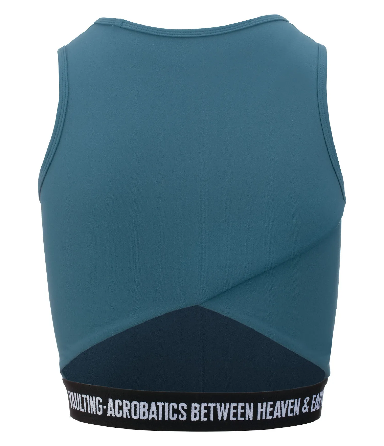 Crop top près du corps avec larges bretelles. Inserts en mesh, au niveau des côtes et des épaules, favorisant la circulation de l’air. Matière respirante et à séchage rapide. Brassière de sport intégrée avec coques amovibles pour un maintien optimal. Il est conseillé de retirer les coques avant le lavage. Bande élastiquée à la taille avec inscription brodée « Vaulting – Acrobatics between heaven & earth ». Découpe croisée travaillée dans le dos. 88 % polyester, 12 % élasthanne (carbone chiné) et 78 % polyester, 22 % élasthanne (aquamarine).