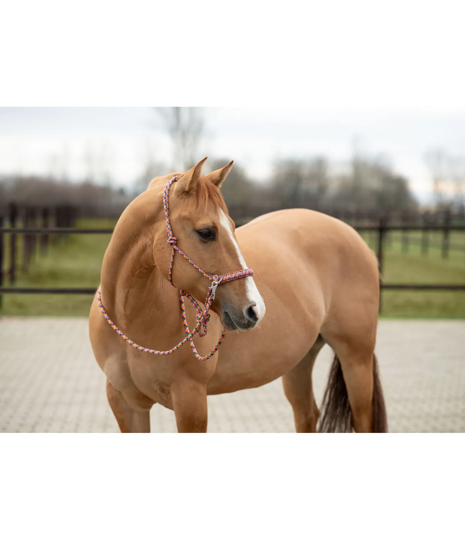 Licol à noeuds haut de gamme. Pour le travail au sol ou monté. En matière souple et résistante. Avec anneaux pour les rênes et muserolle tressée. Épaisseur de la corde 8 mm. Livré avec rênes à mousquetons et longe assorties. Longueur des rênes, mousquetons compris 2,6 m, épaisseur des rênes et de la longe 16 mm. Longueur de la longe 2,4 m.