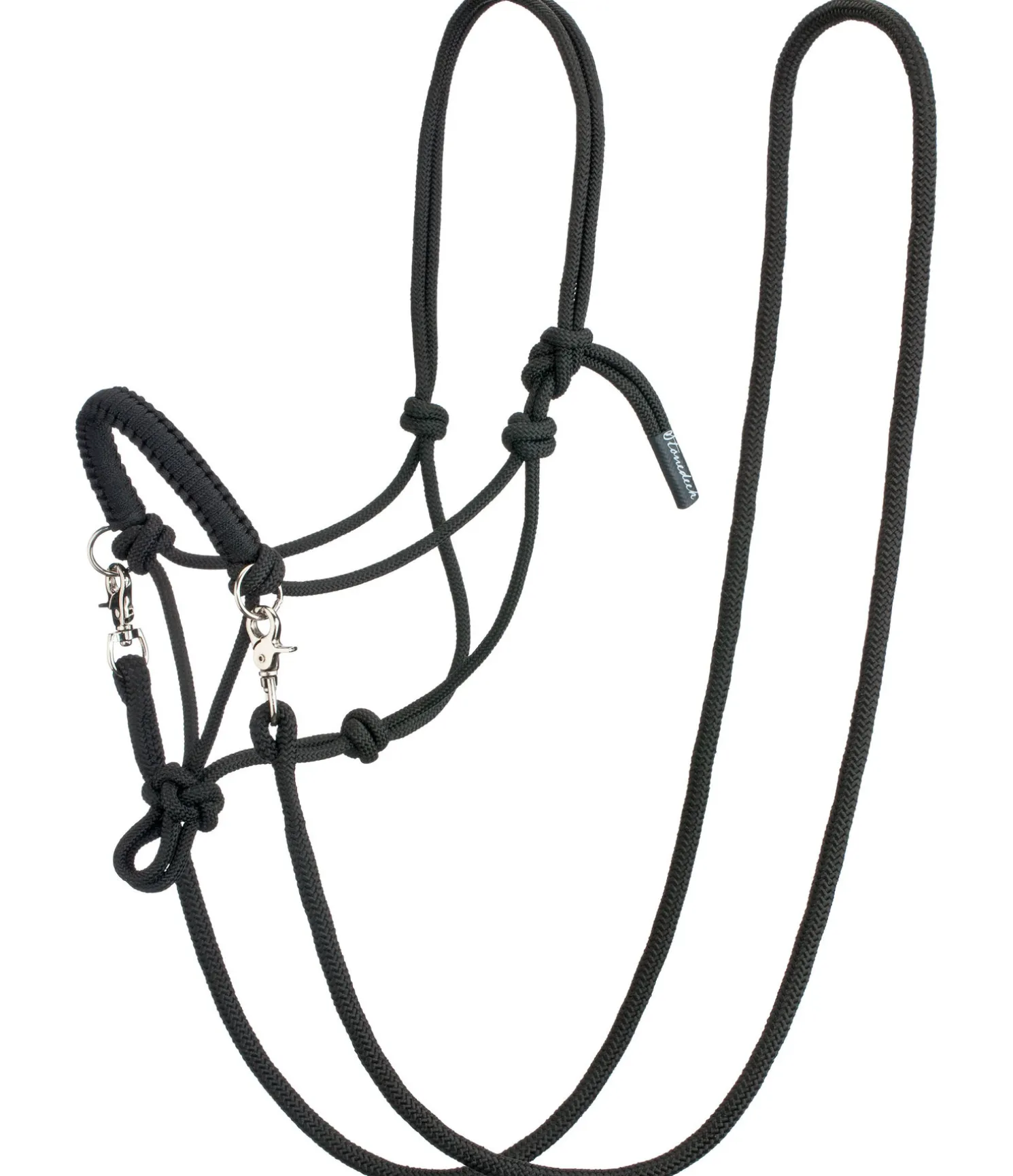 Licol à noeuds haut de gamme. Pour le travail au sol ou monté. En matière souple et résistante. Avec anneaux pour les rênes et muserolle tressée. Épaisseur de la corde 8 mm. Livré avec rênes à mousquetons et longe assorties. Longueur des rênes, mousquetons compris 2,6 m, épaisseur des rênes et de la longe 16 mm. Longueur de la longe 2,4 m.