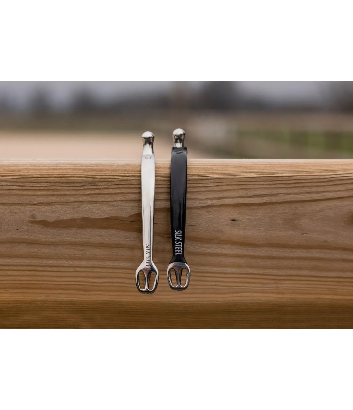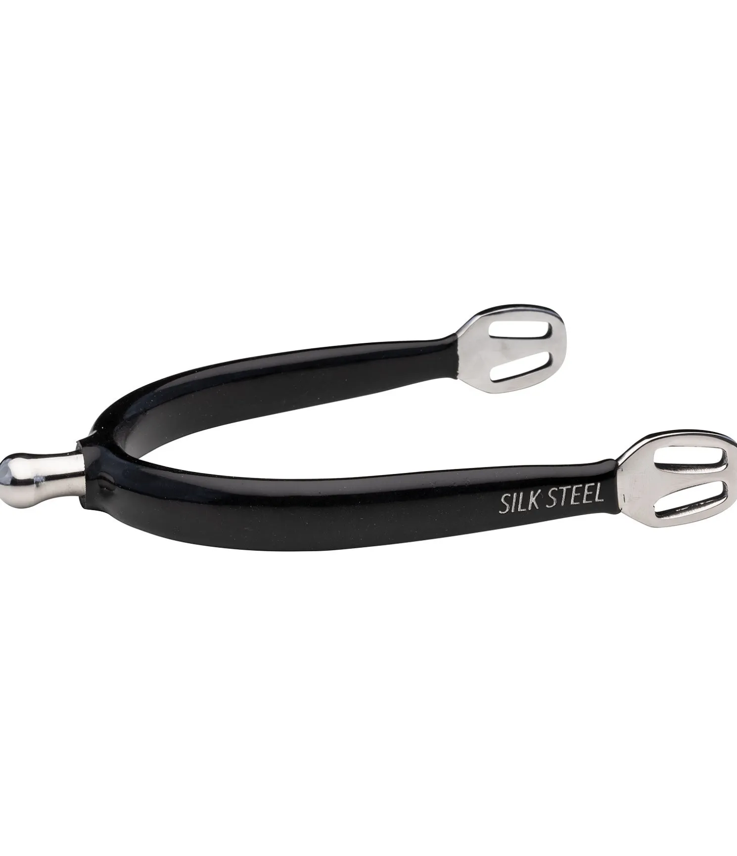 Éperons à bout rond en acier inoxydable. Forme améliorée des oeillets facilitant le passage des lanières. Revêtement en silicone avec inscription SILK STEEL.