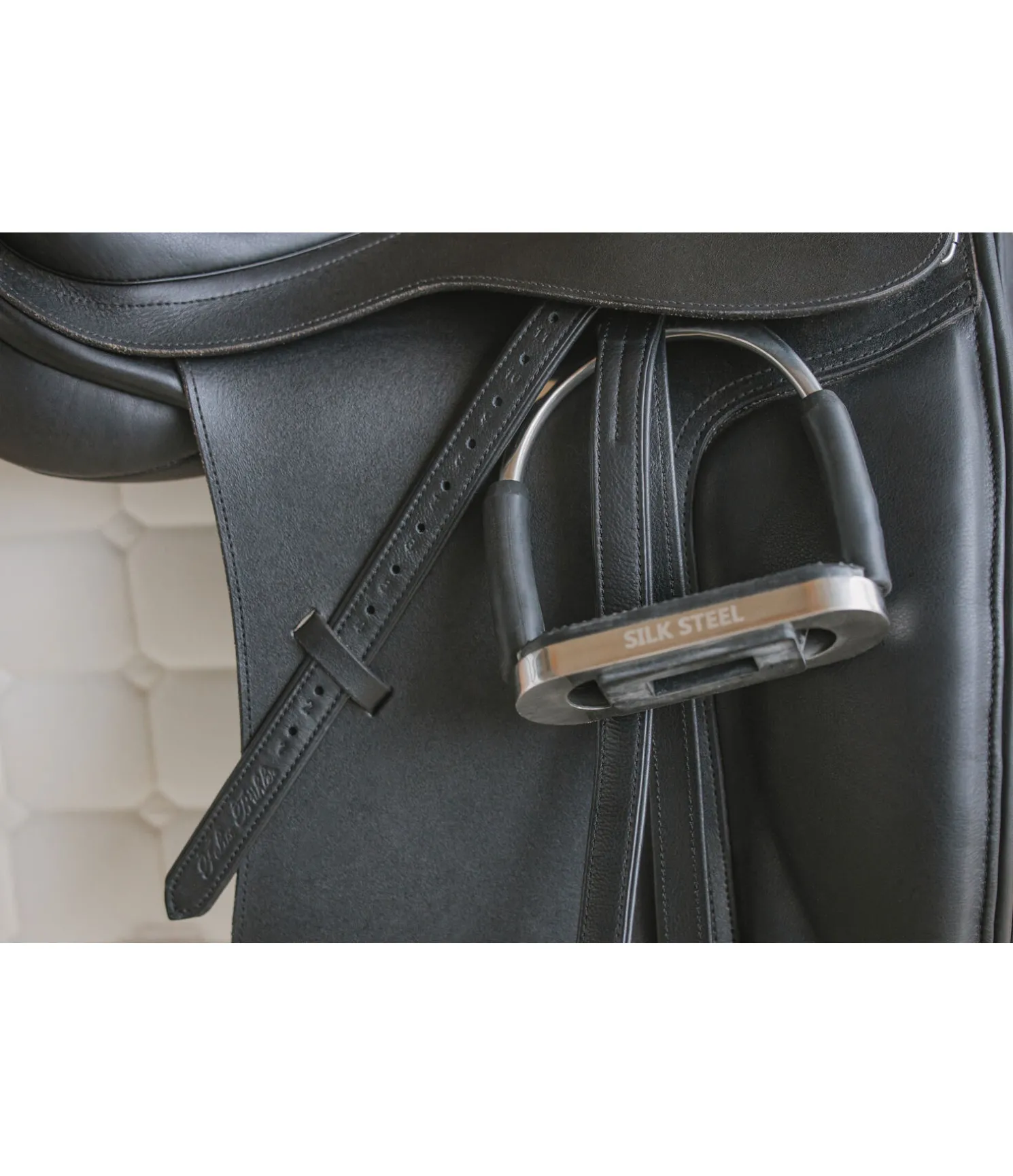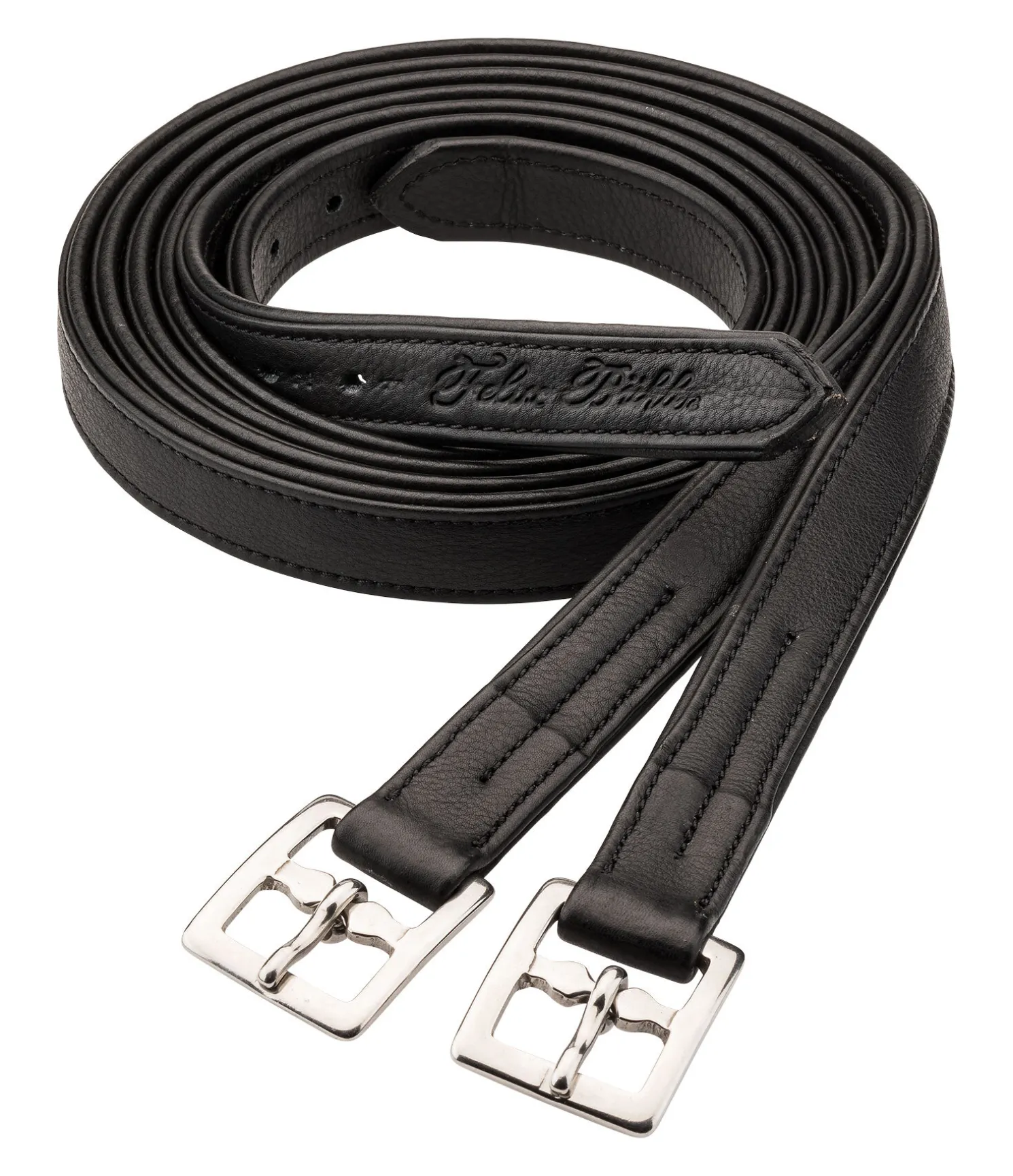 Étrivière de qualité supérieure en cuir de veau extra-doux. Coeur en nylon pour une résistance extrême à la déchirure. Bouclerie en acier argenté légèrement courbée. Largeur 2,5 cm. Vendues par paire.