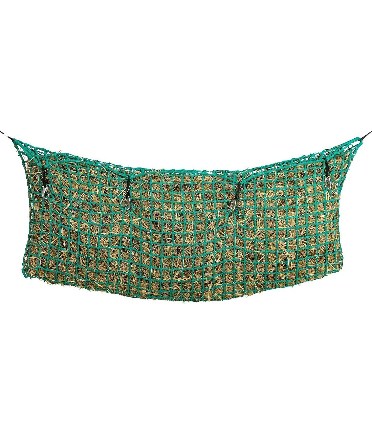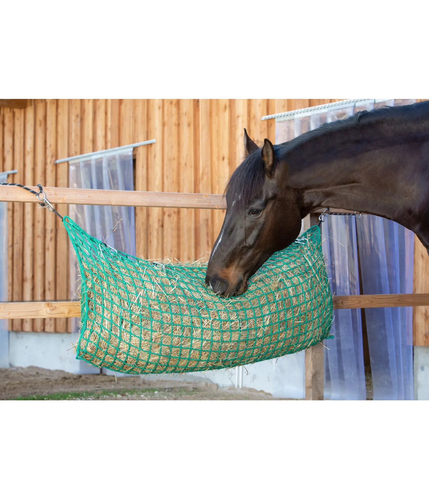 Un filet à foin grand format facile à remplir par le haut et facile à accrocher au moyen des quatre mousquetons de sécurité. Ces mousquetons sont spécialement conçus pour réduire au maximum le risque de blessure pour le cheval. Idéal pour nourrir plusieurs chevaux dans des écuries ouvertes ou des enclos extérieurs. Mailles 4 x 4 cm. 150 x 60 cm. 10 kg.