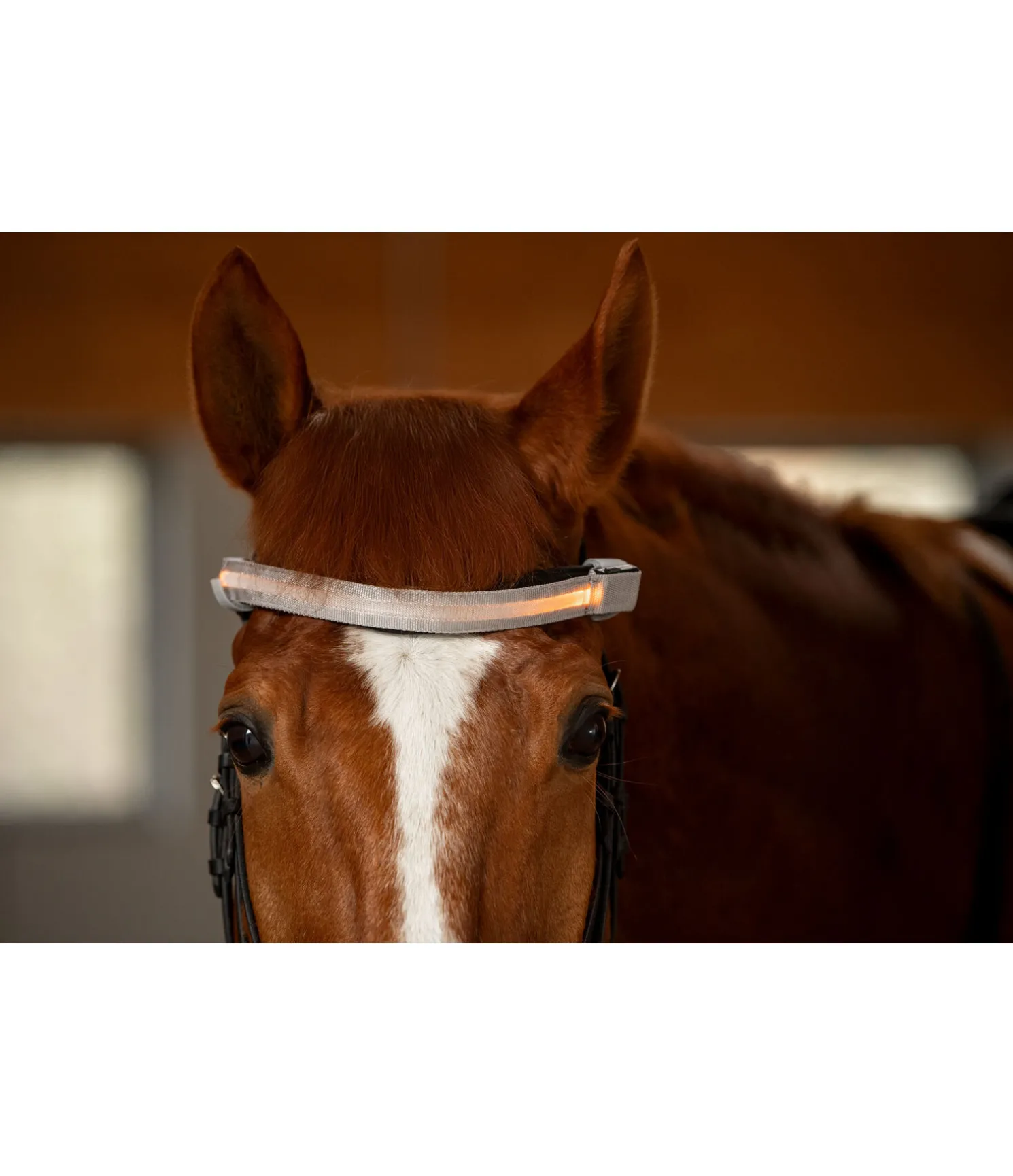 Frontal lumineux à intégrer au licol ou au bridon avec trois fonctions lumineuses différentes. Rechargeable par USB. 33 x 2,5 cm.