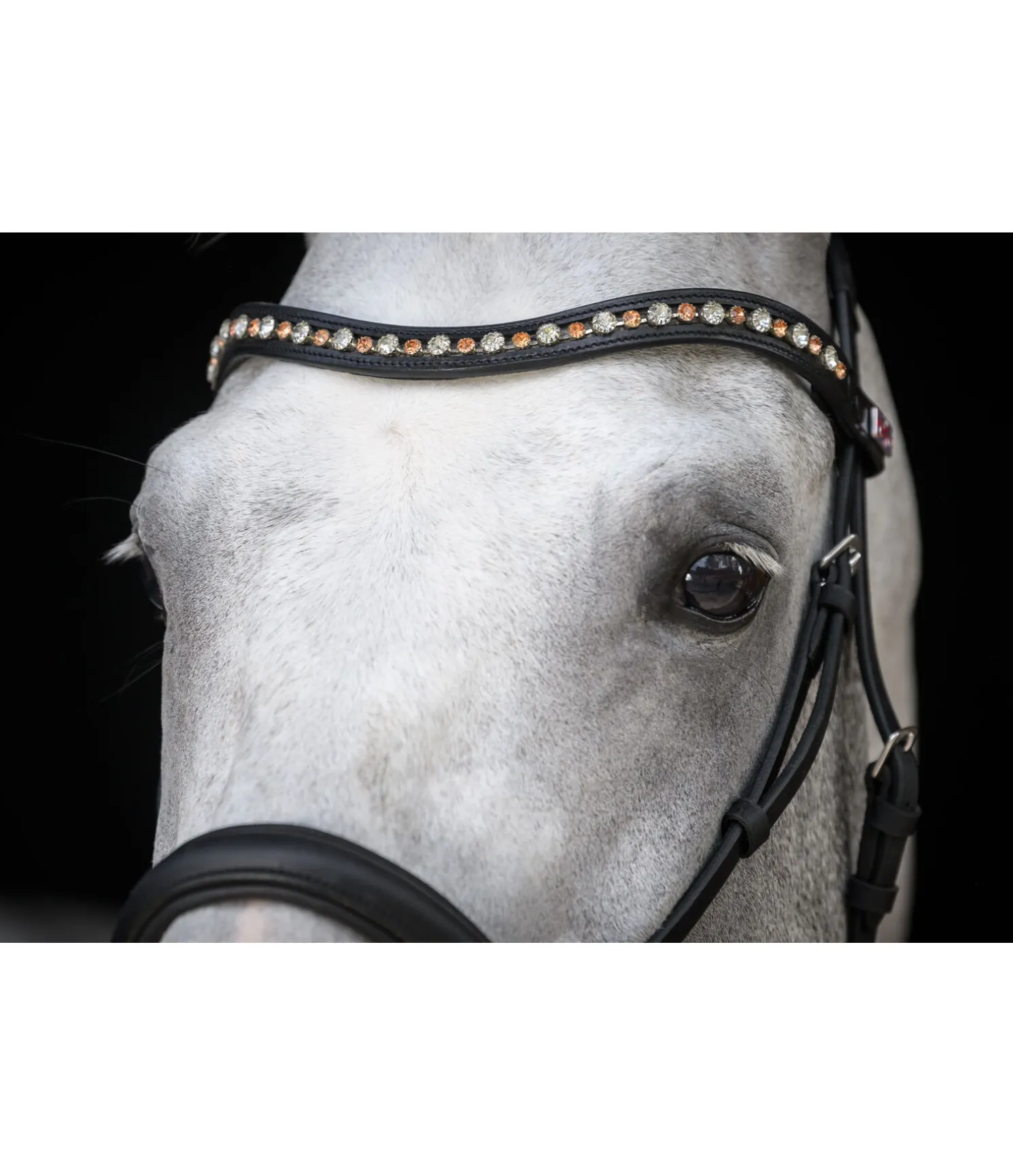 Frontal vague en cuir véritable avec petits et gros strass. Facile à fixer grâce aux boutons-pression.