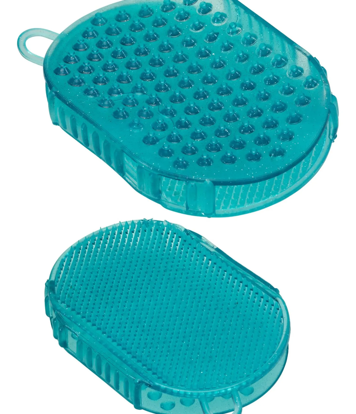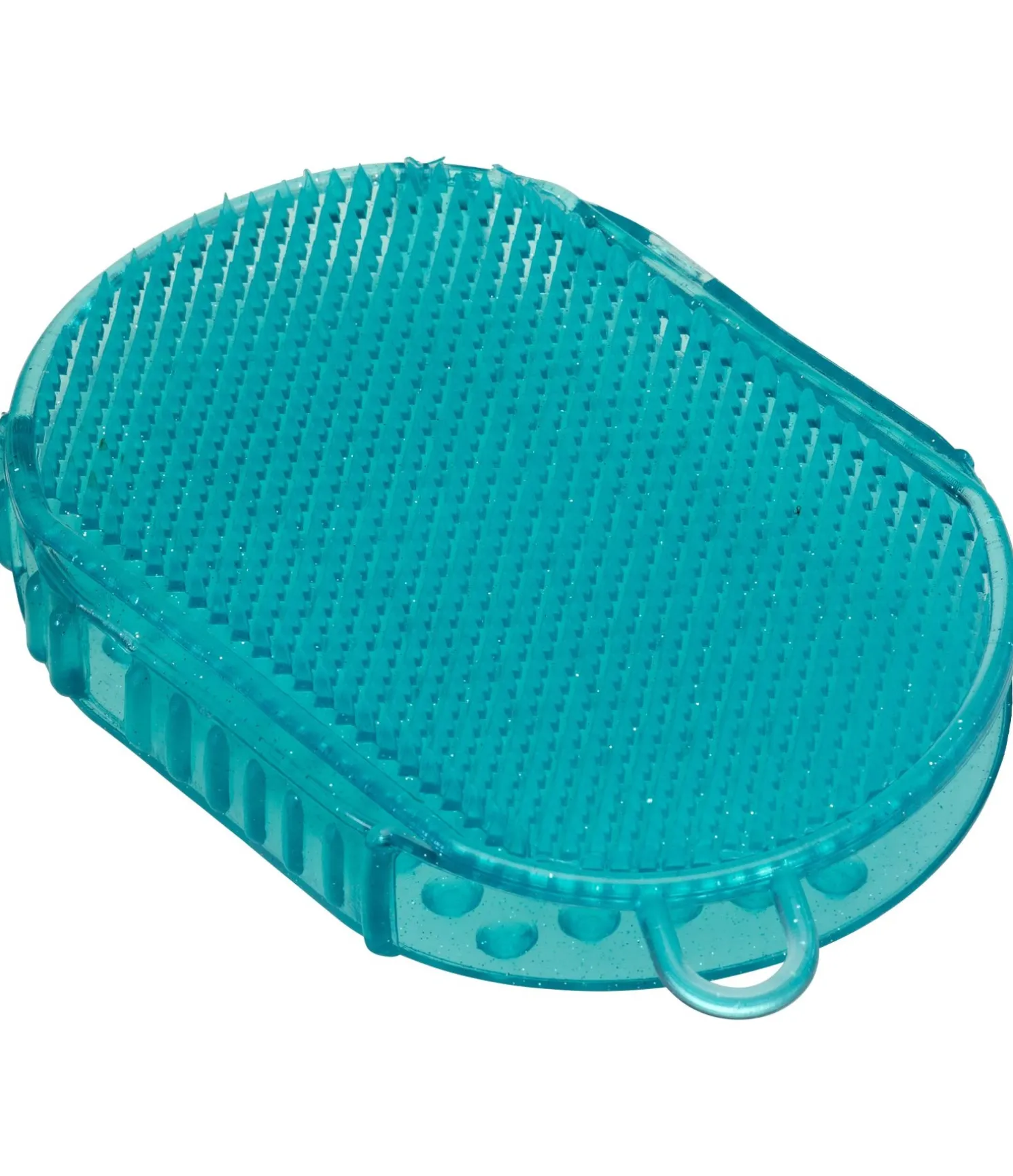 Gant de massage en caoutchouc transparent avec un léger effet pailleté. Idéal pour les soins quotidiens de la robe et les massages. Un côté à petits picots et un côté à gros picots.
