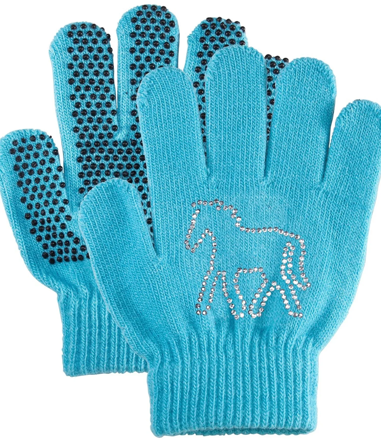 Gants d’équitation agréables et très extensibles ornés d’un cheval en strass. Taille unique, convient à tous les enfants. 50 % polyacrylique, 50 % polyamide.