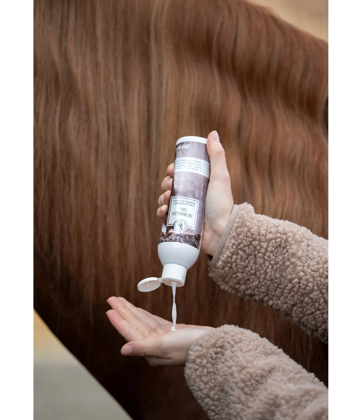 Application : Appliquer sur la paume de la main et répartir sur la crinière et la queue. Bien peigner.