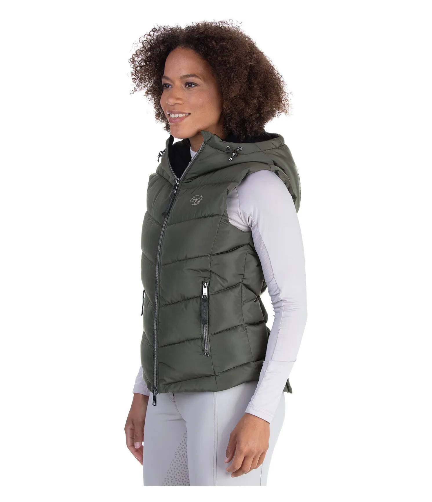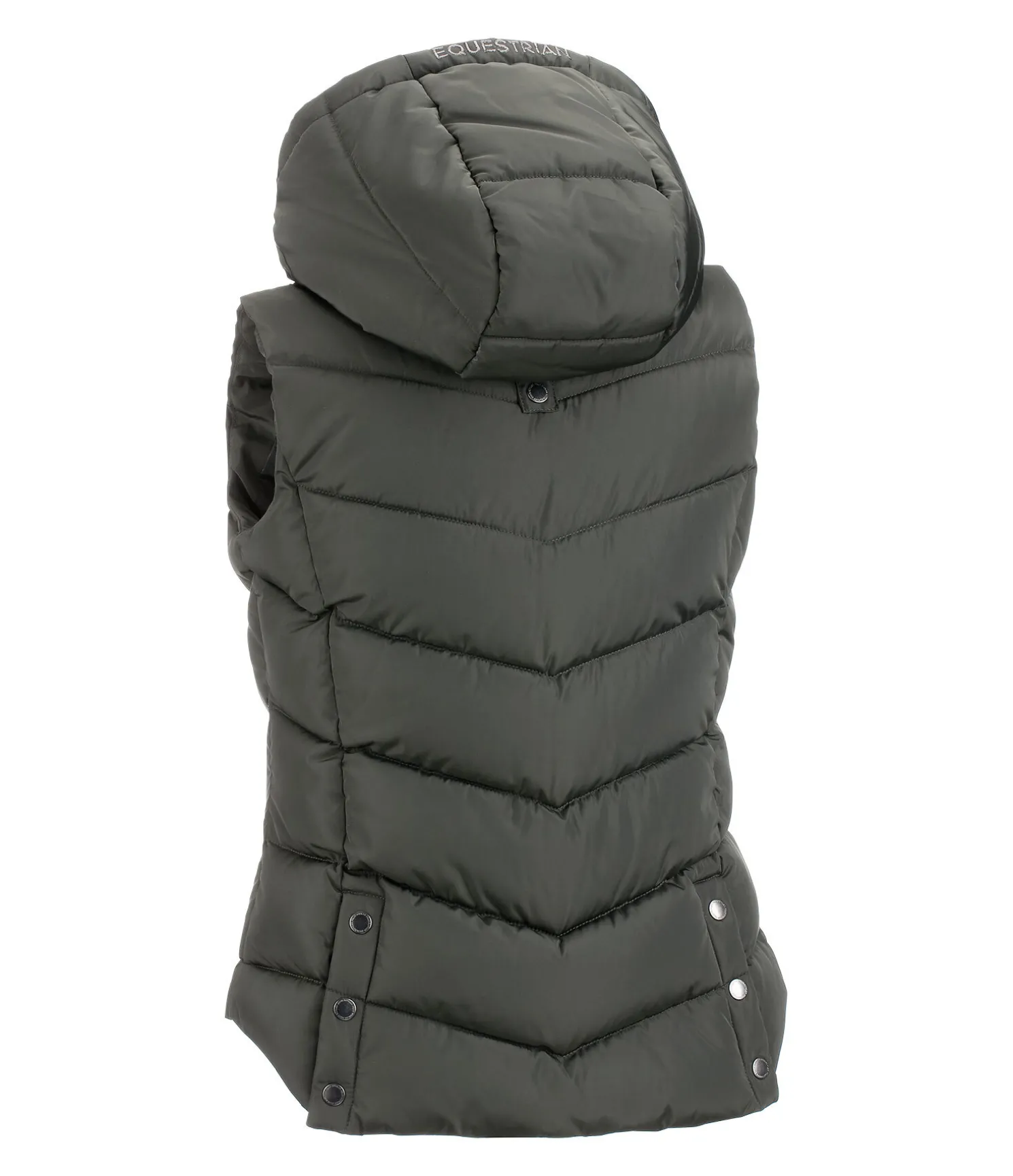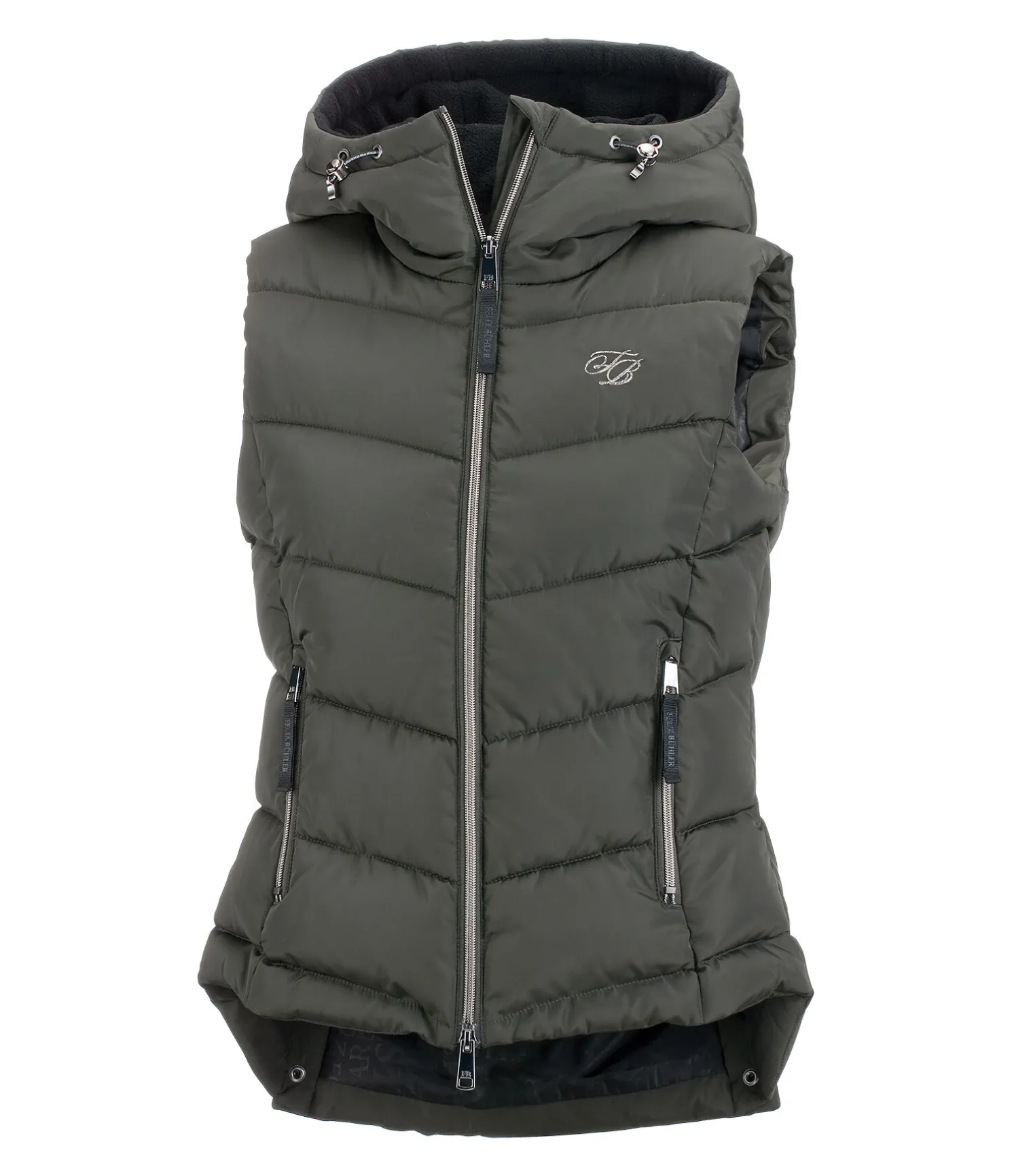 Gilet d’équitation avec doublure chaude. Capuche haute réglable doublée en polaire. Bouton-pression pour fixer la capuche dans le dos. Coupe cintrée légèrement plus longue à l’arrière. 2 poches avant zippées. Fermeture à glissière double sens avec sous-patte et protège-menton. 2 fentes cavalières avec boutons-pression à l’arrière. Garnissage doux imitation duvet. Broderie sur la poitrine et sur la capuche. 100 % polyester.