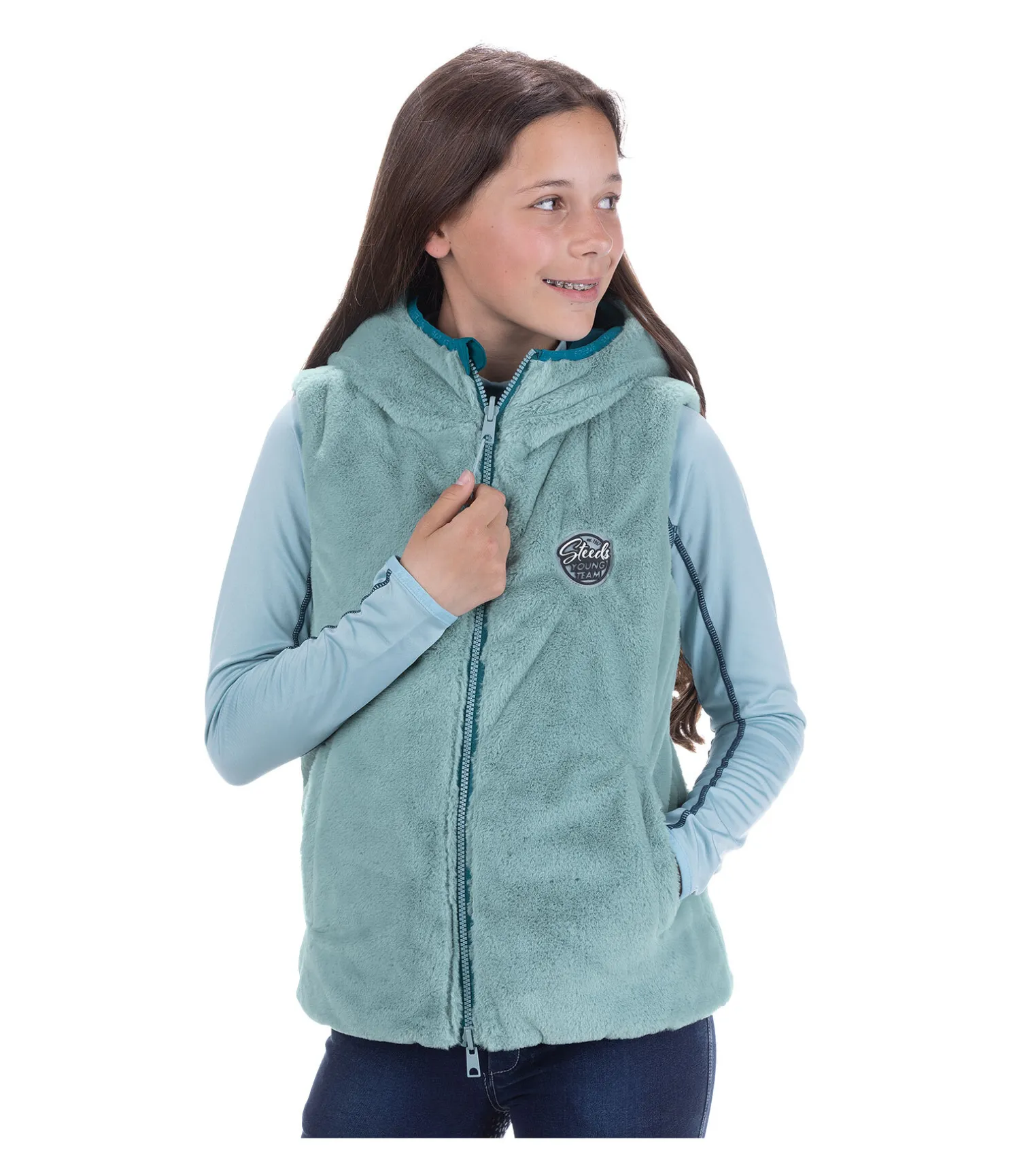 Gilet d’équitation réversible à capuche. Idéal pour les changements de temps. Un côté en polaire Teddy douce et un côté matelassé. Logo sur la poitrine de chaque côté. Fermeture à glissière bidirectionnelle de couleur contrastante avec protège-menton. Deux poches zippées dissimulées sur la face matelassée et non zippées sur la face polaire. 100 % polyester.