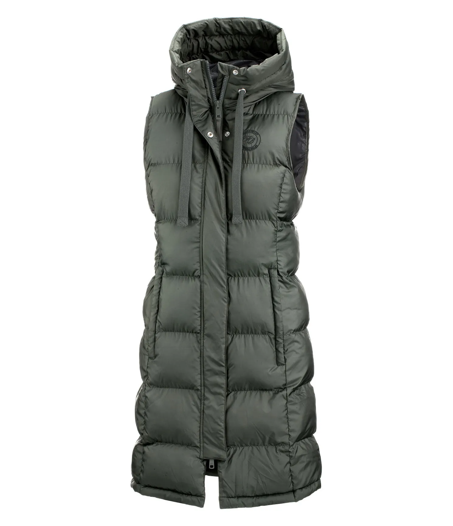 Gilet d’équitation long à capuche. Garnissage doux imitation duvet. Capuche haute réglable avec système d’attache dans le dos. Fermeture à glissière double sens dissimulée. Deux poches latérales zippées dissimulées doublées en polaire douce. Longue fente cavalière zippée avec sous-patte à l’arrière. Broderie Felix Bühler sur la poitrine. 100 % Polyester.