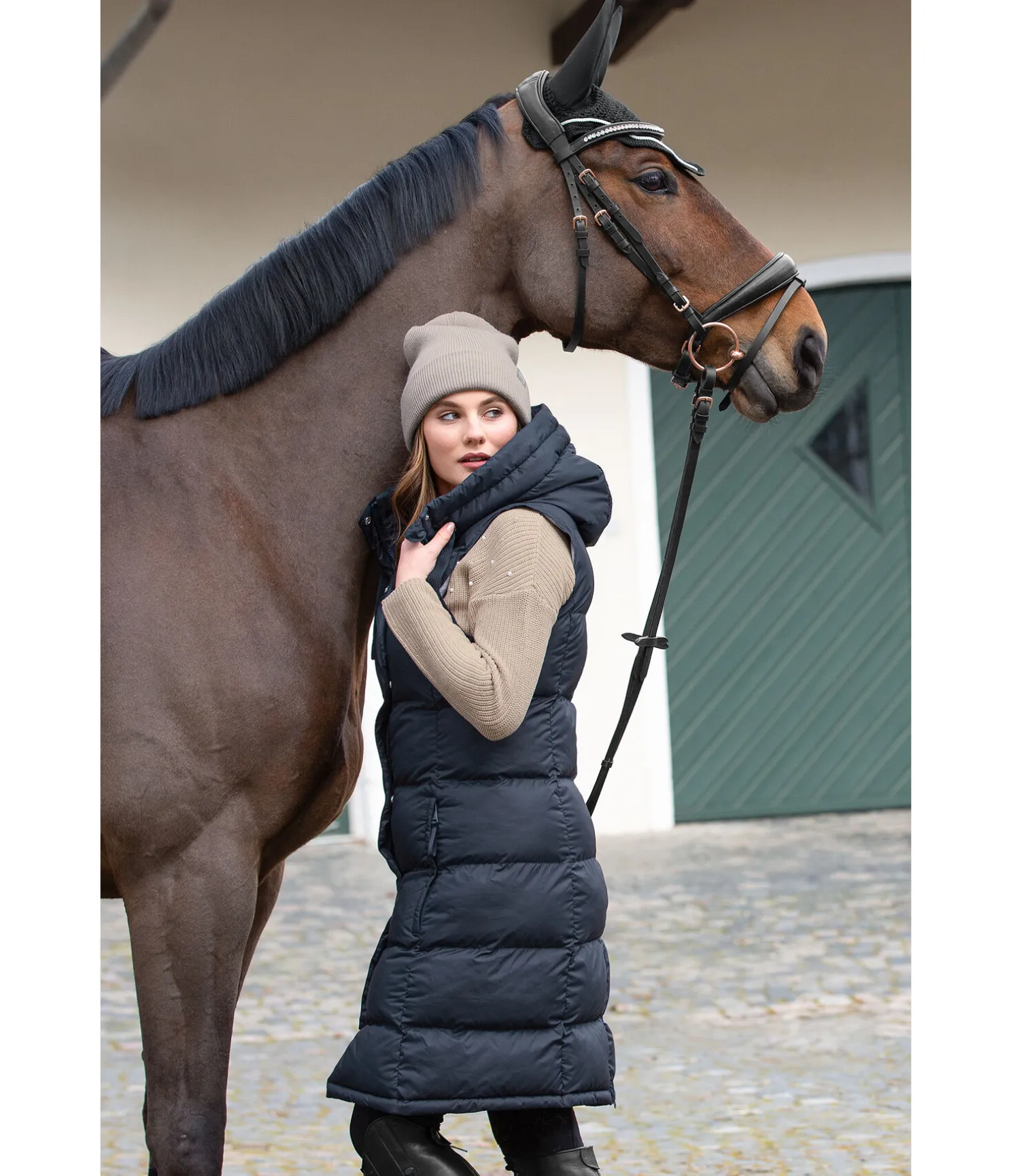 Gilet d’équitation long à capuche. Garnissage doux imitation duvet. Capuche haute réglable avec système d’attache dans le dos. Fermeture à glissière double sens dissimulée. Deux poches latérales zippées dissimulées doublées en polaire douce. Longue fente cavalière zippée avec sous-patte à l’arrière. Broderie Felix Bühler sur la poitrine. 100 % Polyester.