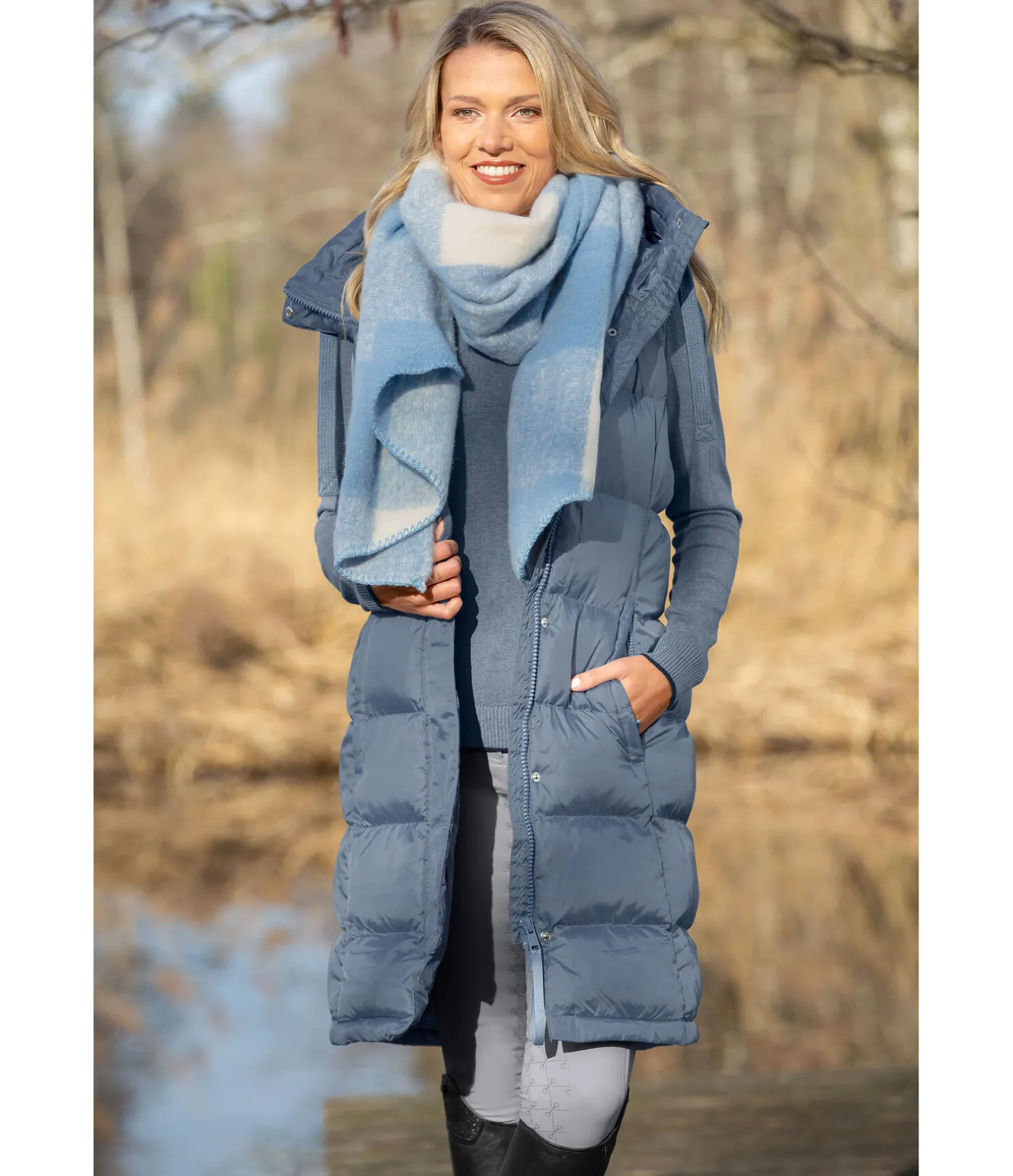 Gilet d’équitation long à capuche. Garnissage doux imitation duvet. Capuche haute réglable avec système d’attache dans le dos. Fermeture à glissière double sens dissimulée. Deux poches latérales zippées dissimulées doublées en polaire douce. Longue fente cavalière zippée avec sous-patte à l’arrière. Broderie Felix Bühler sur la poitrine. 100 % Polyester.