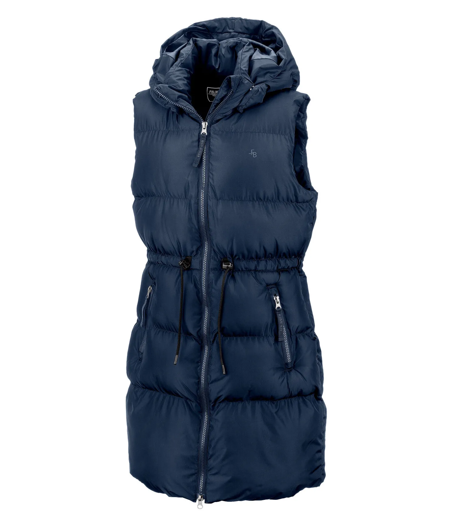 Gilet d’équitation long pour enfant avec garnissage doux en imitation duvet. Capuche rembourrée, réglable et amovible pouvant être fixée dans le dos. Fermeture à glissière double sens avec sous-patte, 2 poches zippées et doublées en polaire douce devant. Longue fente cavalière zippée à l’arrière. Imprimé logo Felix Bühler sur la poitrine. 100 % polyester.