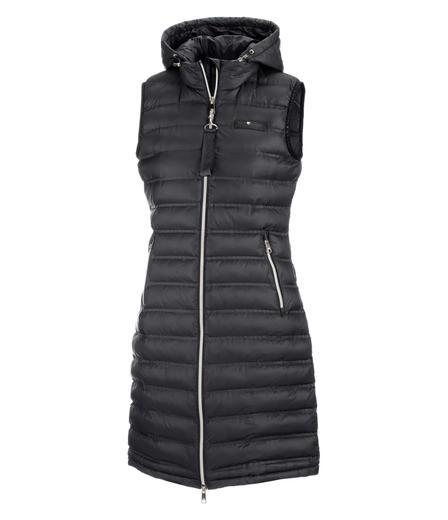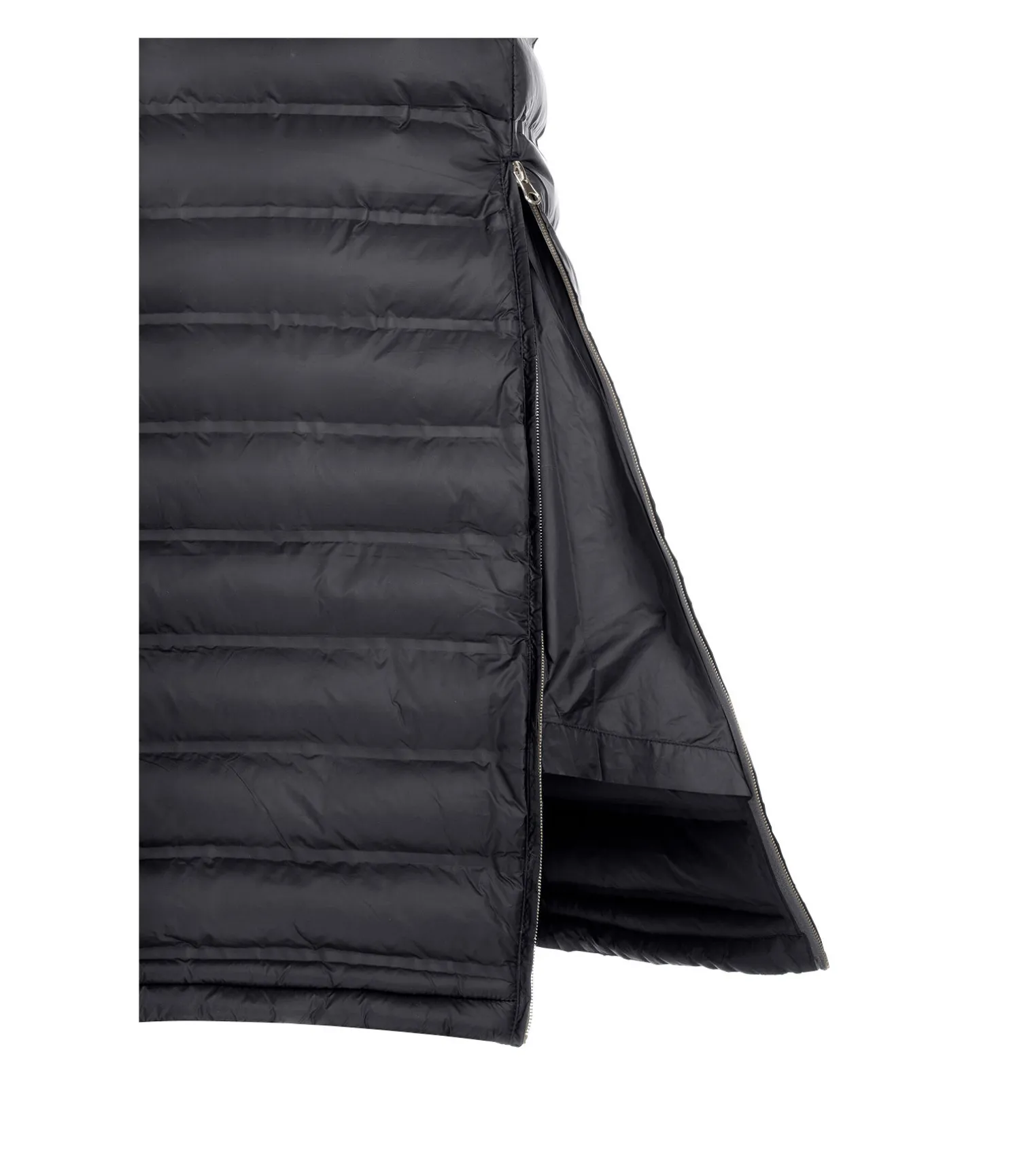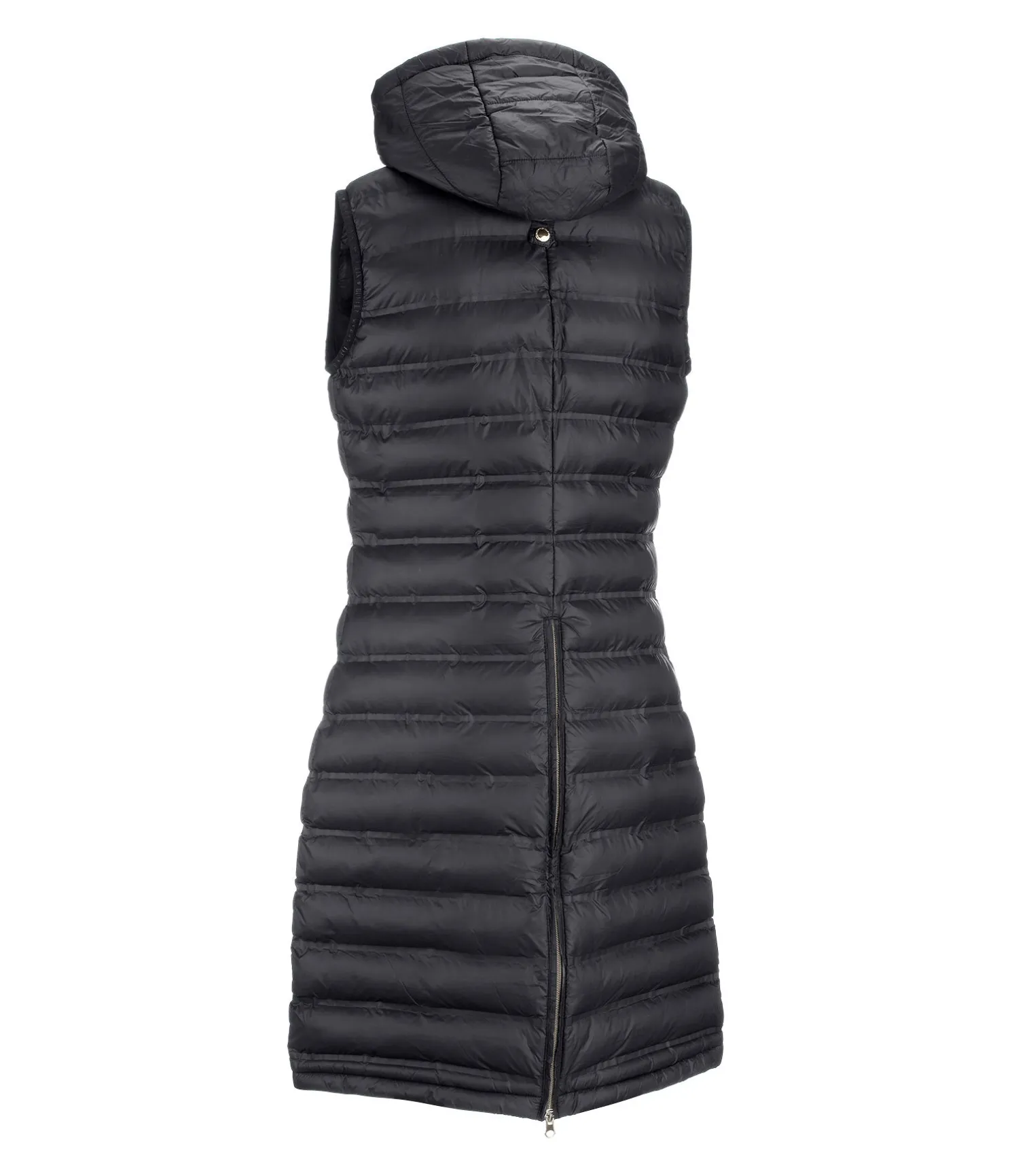 Gilet long léger matelassé avec coutures thermosoudées. Garnissage léger en imitation duvet. La capuche peut se ranger dans le col, s’enlever facilement grâce à la fermeture à glissière ou se fixer dans le dos grâce au bouton-pression. Longue fente cavalière zippée à l’arrière, fermeture à glissière double sens avec sous-patte et protège-menton, 2 poches zippées à l’avant. Badge Felix Bühler sur la poitrine. Poignets élastiqués. 100 % nylon.