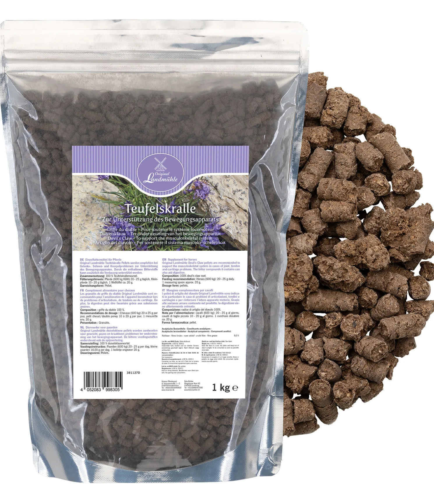 Recommandations de dosage : cheval (600 kg) 20 à 25 g par jour, 1 mesure = env. 20 g.