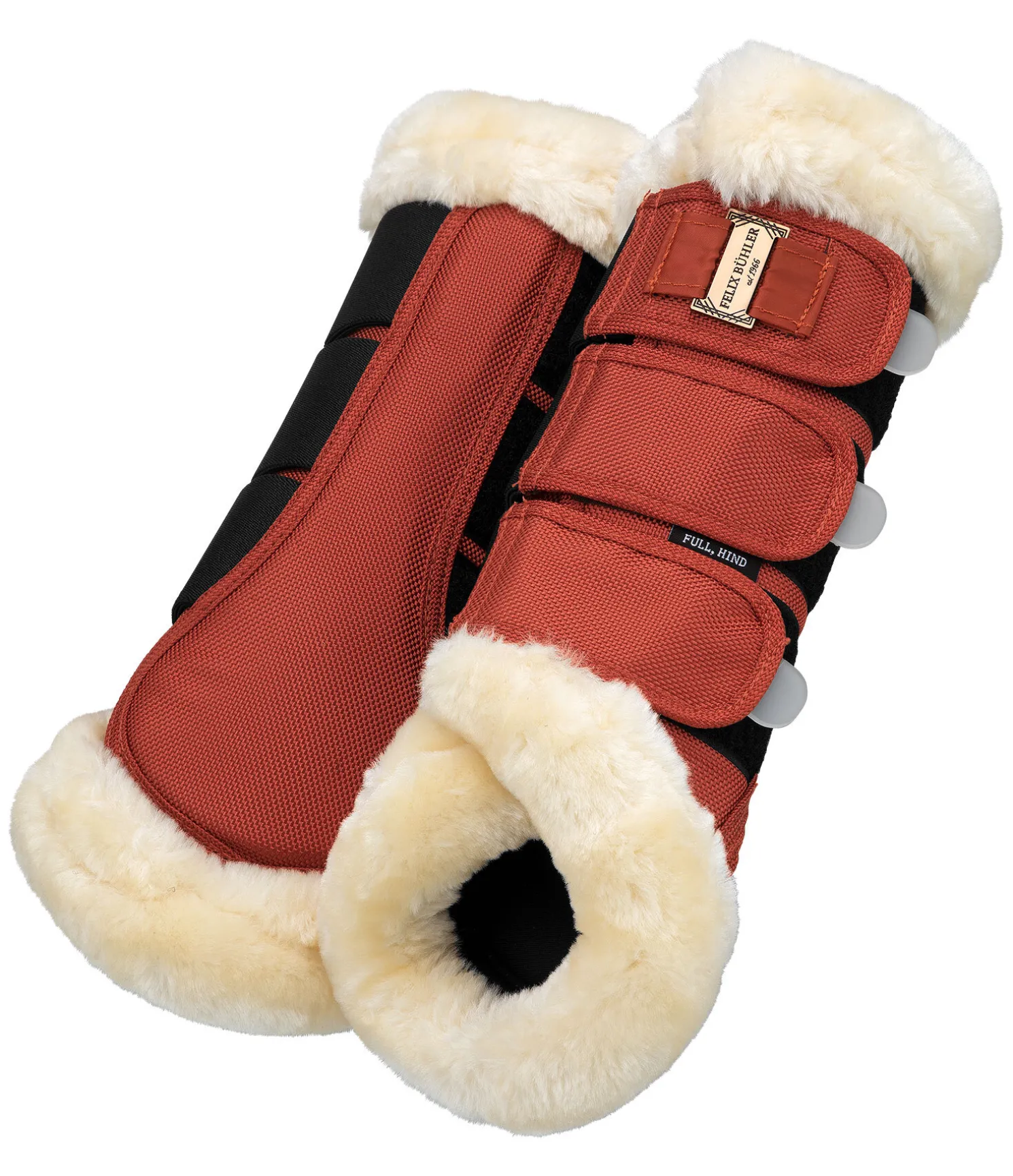 Élégantes guêtres de dressage avec bordure en polaire Teddy douce. Doublure moelleuse en caoutchouc chloroprène pour une protection optimale contre les impacts. Revêtement anti-salissures en matière résistante 600 deniers. Forme anatomique, pattes auto-agrippantes avec empiècements élastiques pour un ajustement parfait. Plaque métallique avec logo Felix Bühler. Doublure intérieure 100 % caoutchouc chloroprène, revêtement 100 % polyester. Vendues par paire.