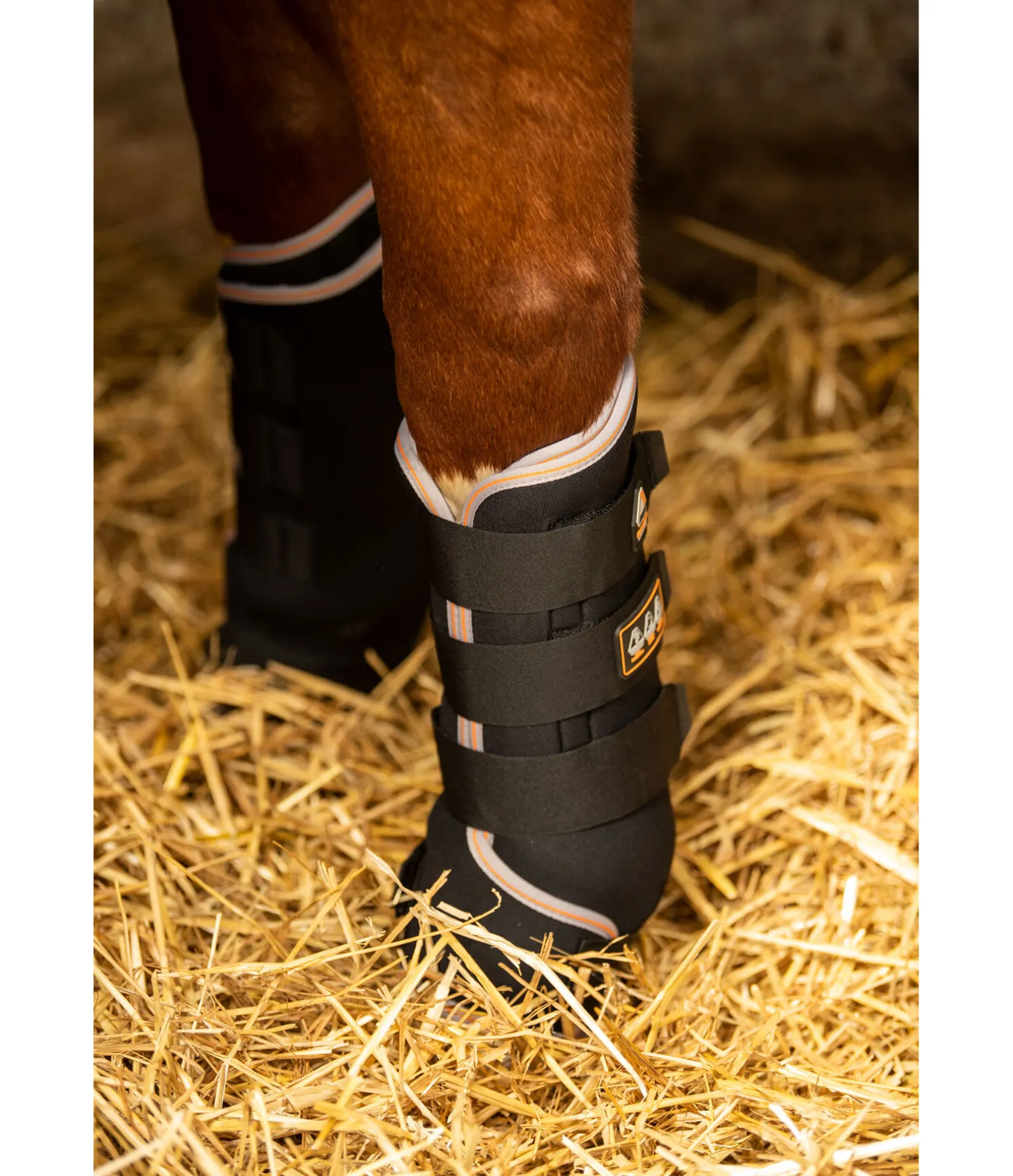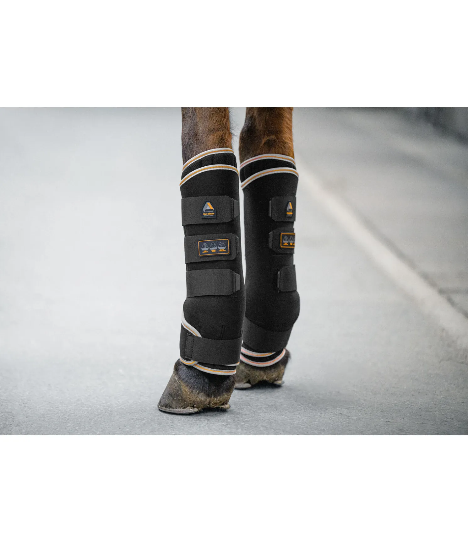 Guêtres d’écurie relaxantes avec doublure moelleuse en caoutchouc-chloroprène souple. À l’intérieur, un coussin contenant des fibres de céramique qui réfléchissent la chaleur corporelle et améliorent sensiblement la circulation sanguine s’ajuste parfaitement grâce aux pattes auto-agrippantes. Peuvent accélérer la guérison et réduire les douleurs liées à des maladies chroniques de l’appareil locomoteur. Idéales en cas d’arthrose, d’éparvins ou de nécrose de la pince, surtout pour éviter une mise en route « à froid » après une nuit au box. Coupe particulièrement longue qui descend jusqu’à la couronne pour une protection optimale. Forme anatomique. 4 pattes auto-agrippantes pour un ajustement et maintien parfaits. Convient pour les antérieurs et les postérieurs. Lavables en machine à 30° C (veillez à fermer les pattes auto-agrippantes avant le lavage). Ne pas mettre au sèche-linge. 100 % nylon, doublure 100 % caoutchouc-chloroprène. Vendues par paire.