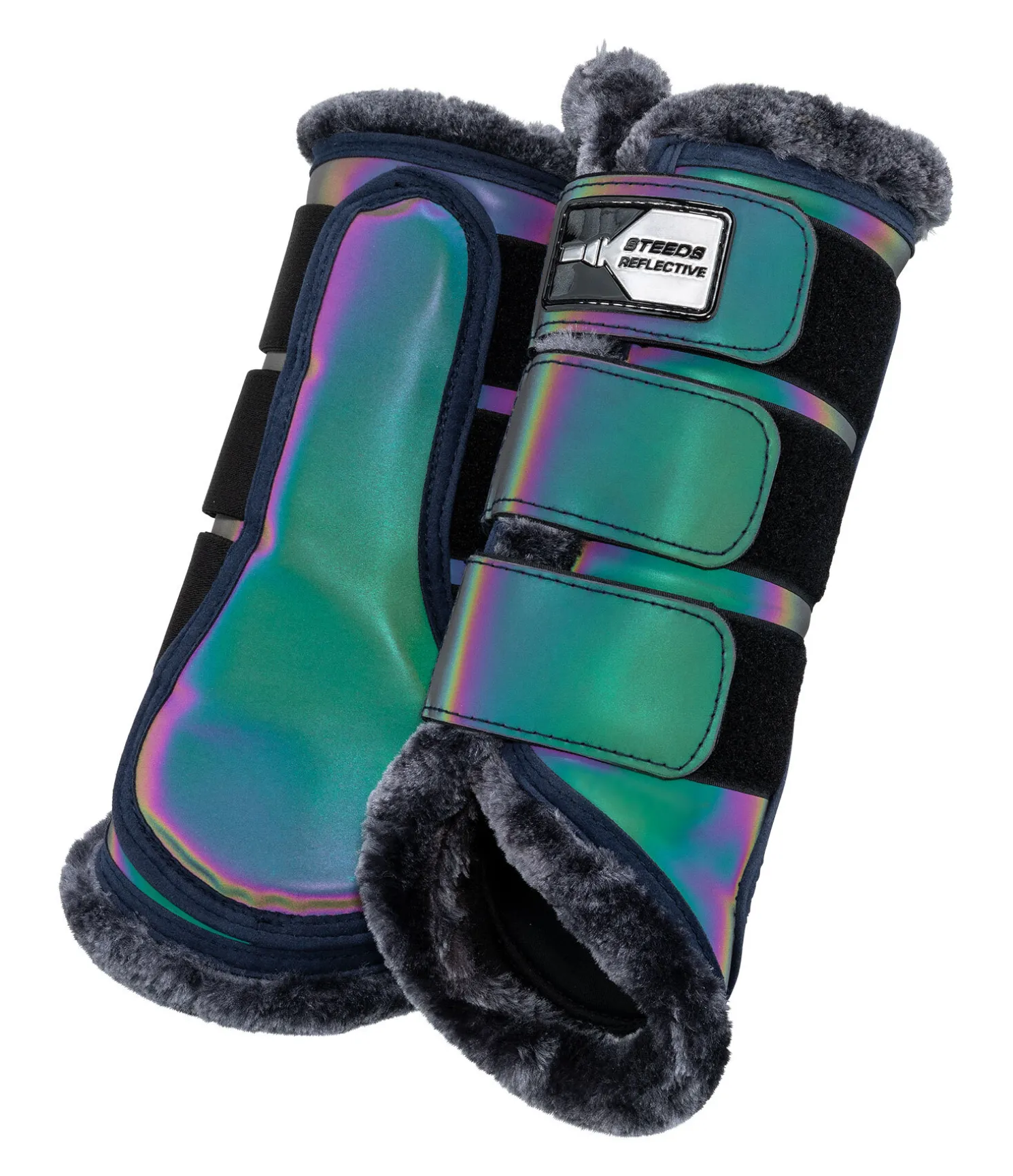 Guêtres holographiques. Réfléchissent la lumière aux couleurs de l’arc-en-ciel. Avec bordure en polaire Teddy douce pour éviter les irritations liées aux frottements. Trois pattes auto-agrippantes élastiquées pour un ajustement optimal. Forme anatomique s’adaptant de façon idéale aux antérieurs du cheval. Protection optimale contre les chocs grâce à la matière extérieure robuste et déperlante. Surface lisse pour faciliter le nettoyage. Doublure intérieure en caoutchouc-chloroprène moelleux.