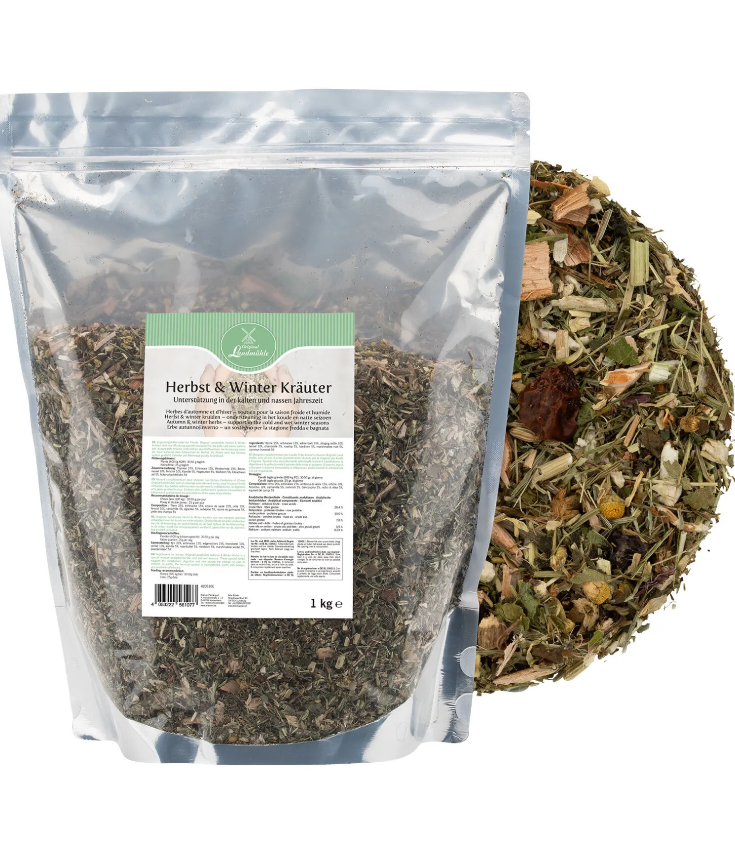 Les herbes Automne & Hiver sont un mélange spécialement conçu pour la saison froide et humide. Les herbes sélectionnées soutiennent le métabolisme, la digestion et la peau pendant la mue en automne. Influencent positivement et renforcent le système immunitaire, les articulations et les voies respiratoires pendant l’hiver.