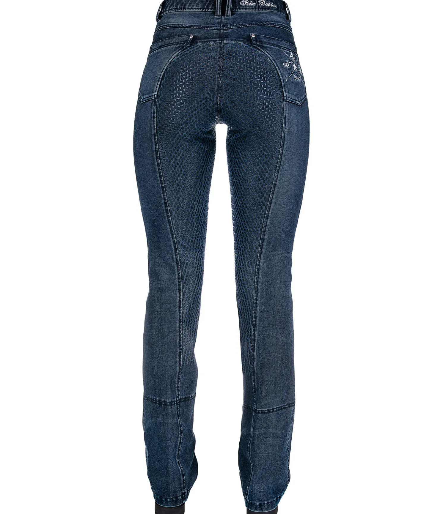 Jeans d’équitation jodhpur avec fond intégral grip en silicone. Effet vintage. Matière ultra souple et confortable. Ceinture élastiquée. 2 poches avant et arrière. Coupe bootcut. Aucune couture au niveau des genoux. Sous-pied élastique réglable. 60 % coton, 24 % polyester, 10 % viscose, 6 % élasthanne.