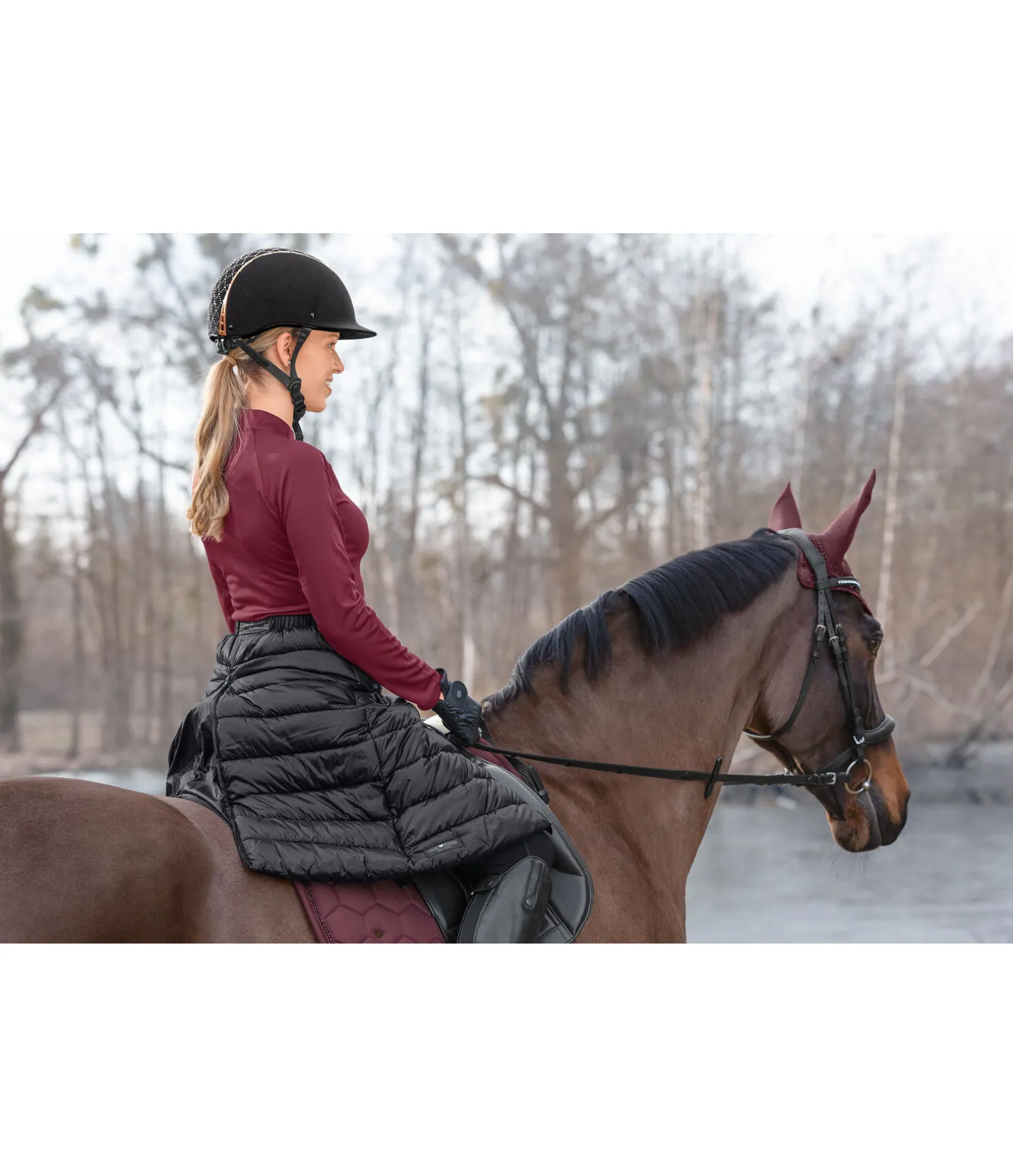 Avoir du style tout en restant bien au chaud ! Superbe jupe d’équitation thermique. Se met et s’enlève facilement grâce à la fermeture à glissière double sens à l’avant sur toute la longueur. Fente cavalière doublée et extra longue à l’arrière. Deux poches latérales zippées. Bouton-pression à la taille. Passants de jambes. Parfaite pour des balades à vélo ou pour promener son chien. 100 % nylon.